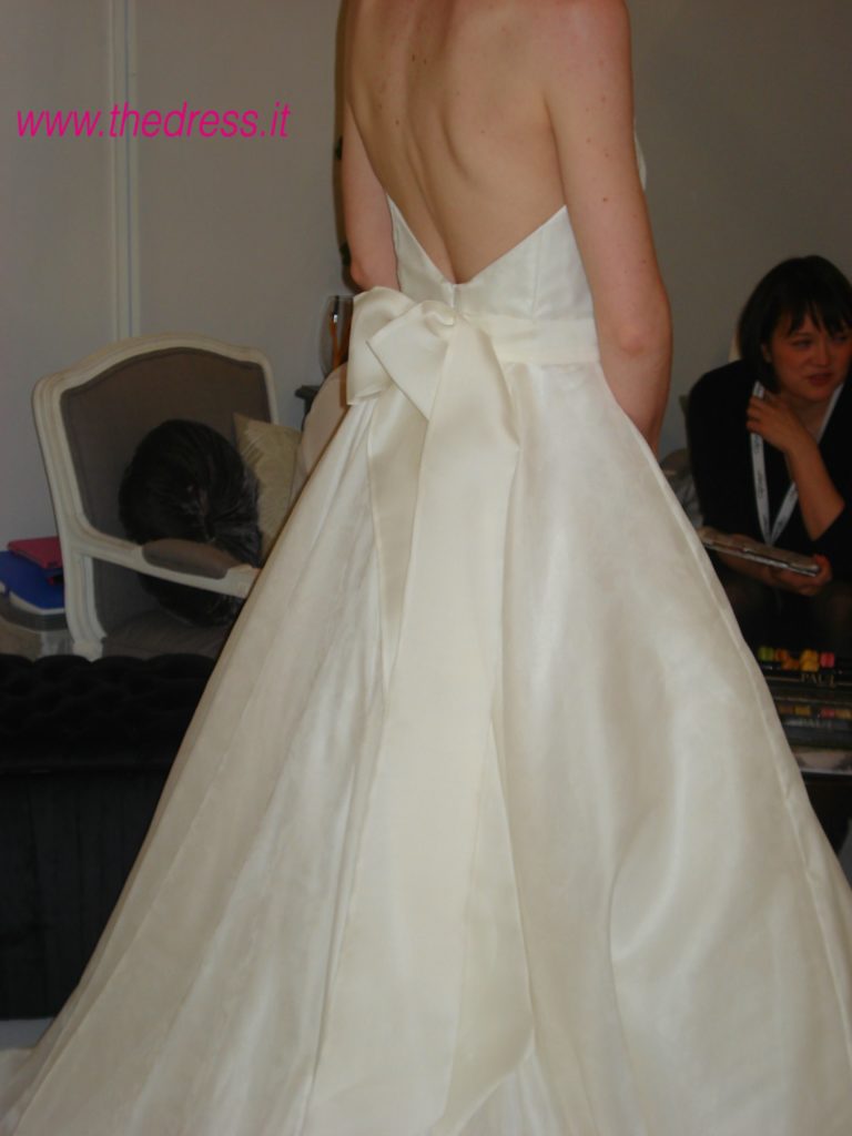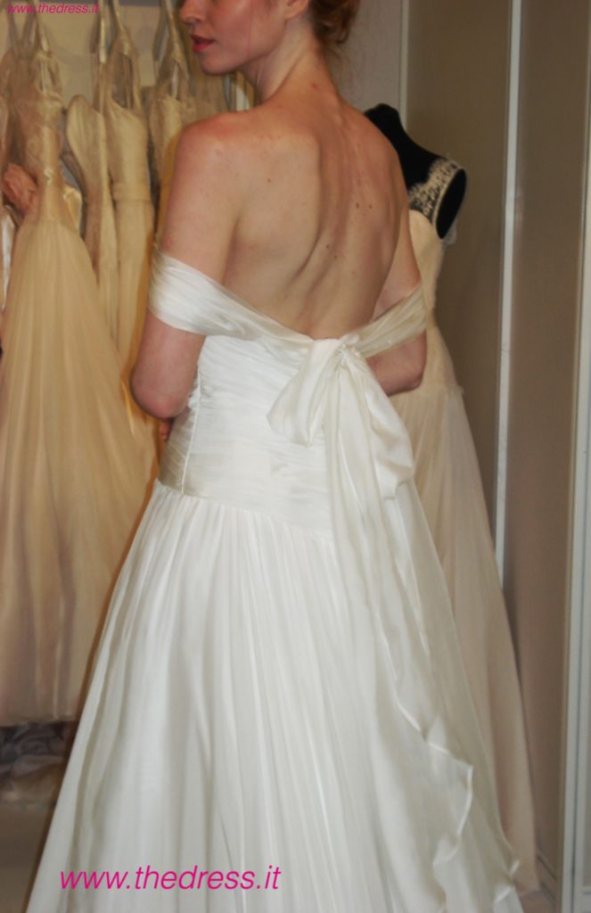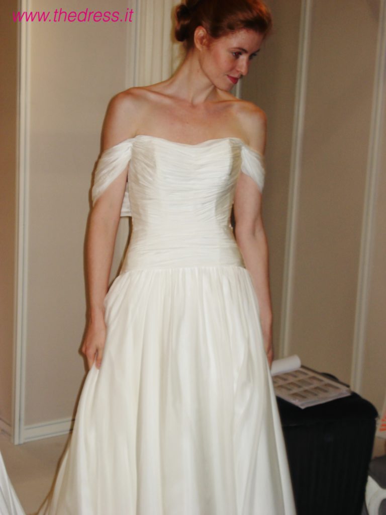 Segno distintivo della stilista anche gli abiti da sposa con dettagli glamour come fiocchi e fiori, anche nei toni del pesca o cipria.