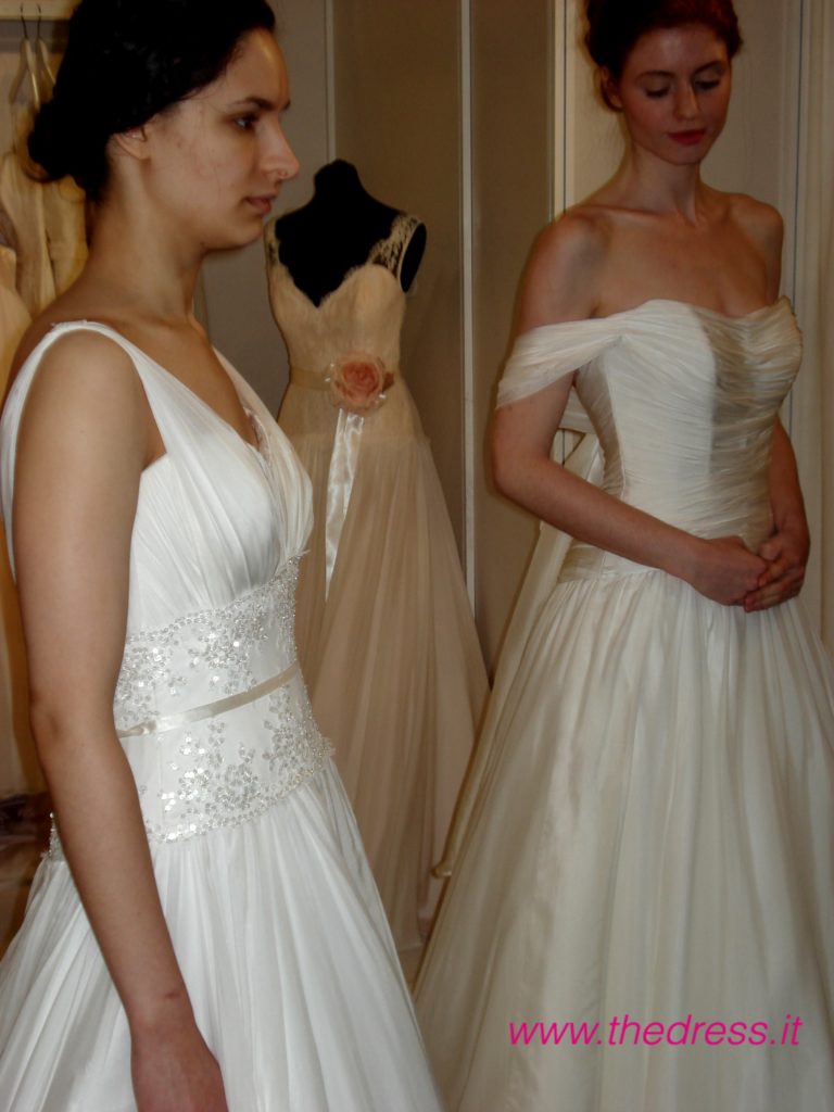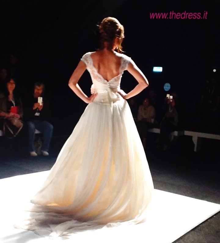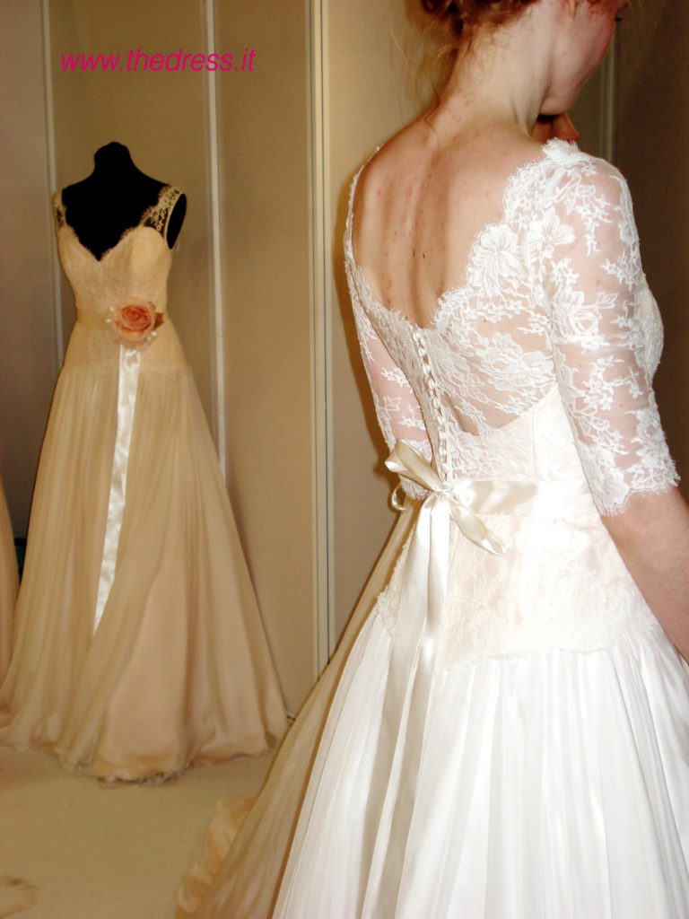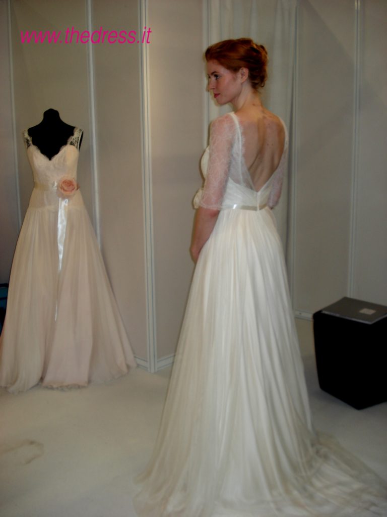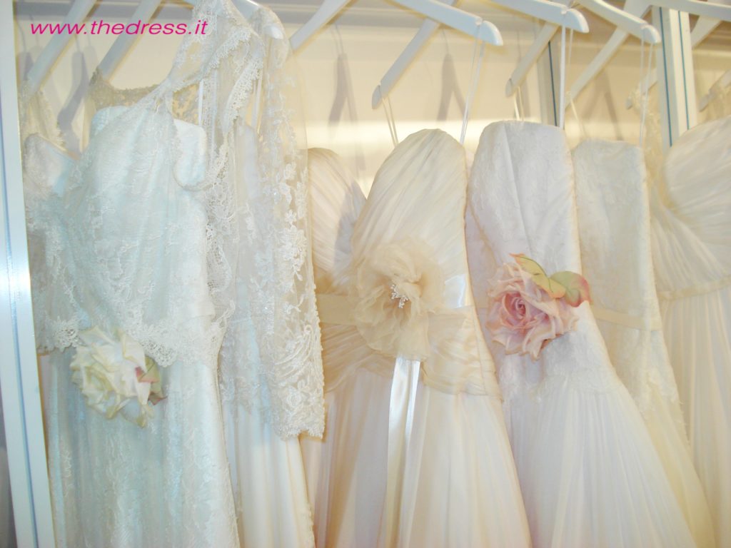 “Utilizzo solo i tessuti più pregiati – spiega la stilista – come voile di seta, chiffon e organza di seta, abbelliti delicatamente con pizzo francese, bouquet in seta fatti a mano e sottili ricami, in toni vintage come il pesca, il rosa cipria e caffè al latte così come il tradizionale avorio”.