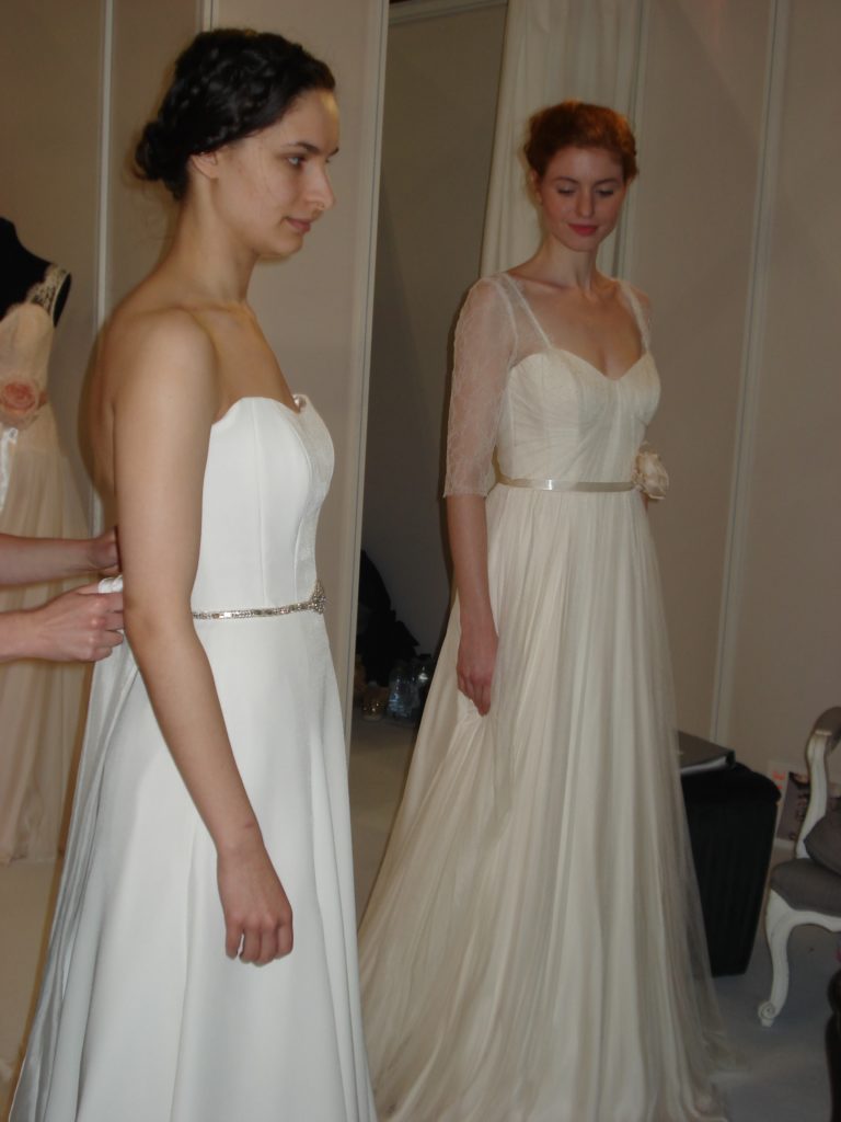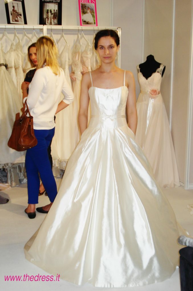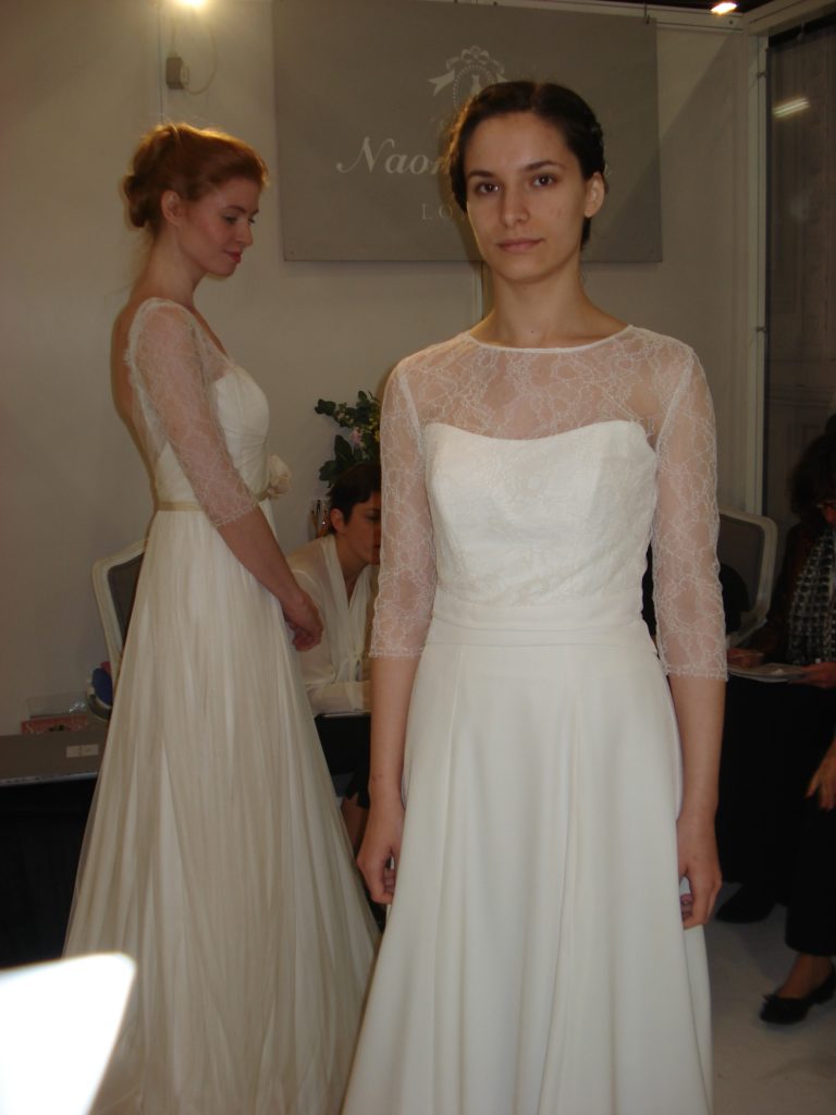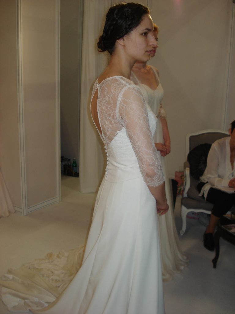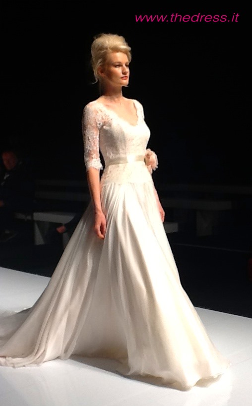 “Utilizzo solo i tessuti più pregiati – spiega la stilista – come voile di seta, chiffon e organza di seta, abbelliti delicatamente con pizzo francese, bouquet in seta fatti a mano e sottili ricami, in toni vintage come il pesca, il rosa cipria e caffè al latte così come il tradizionale avorio”.