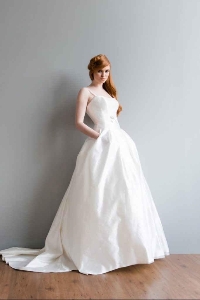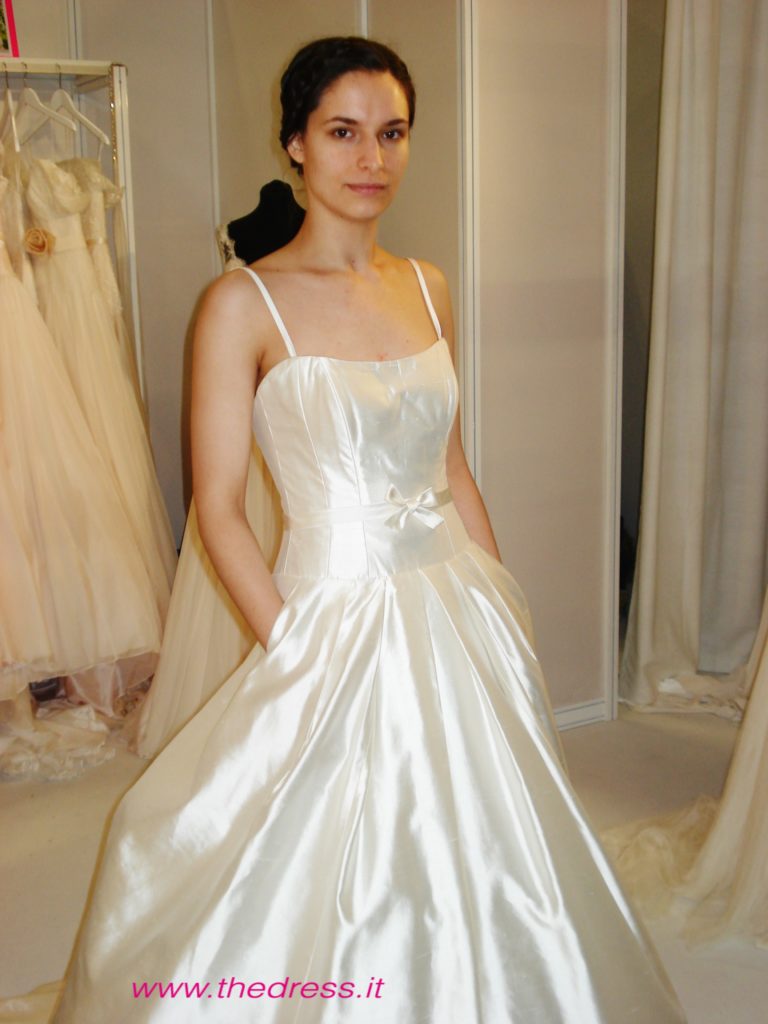 Ecco “Audrey”, ispirato all'attrice icona di stile e umanità Audrey Hepburn; un abito ampio in Shatung di seta con corsetto e sottili spalline, gonna ampia a pieghe con tasche e deliziosa cinturina con piccolo fiocco in vita.
