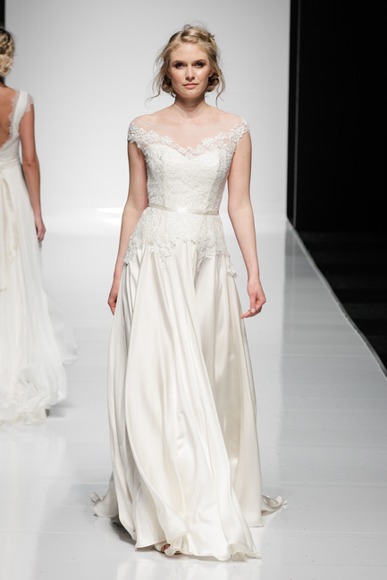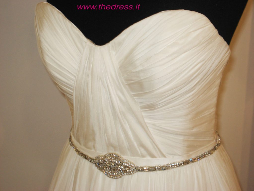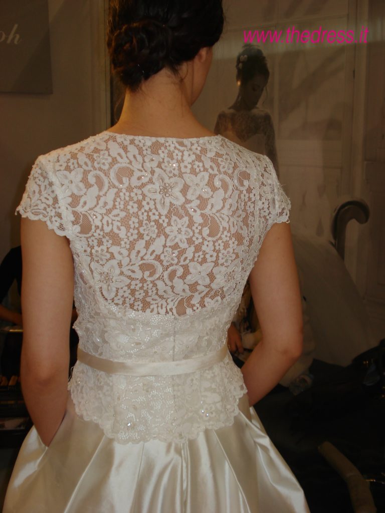 Molto tradizionale anche l'abito da sposa “Sienna”, un modello senza spalline avorio in crepe di seta, abbinato a giacchino in pizzo Chantilly con apertura sulla schiena e dettagli in tessuto.
