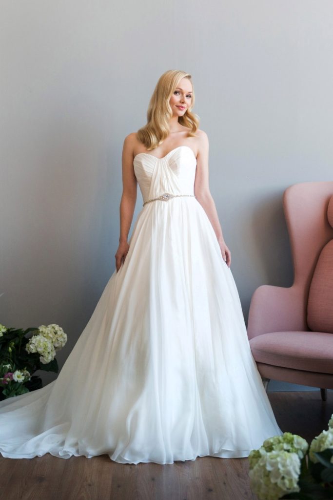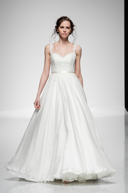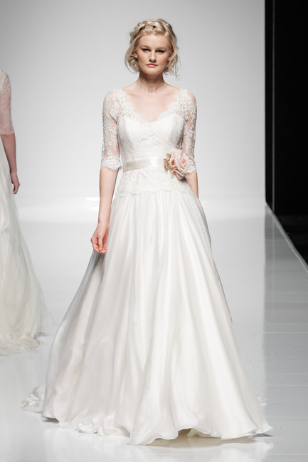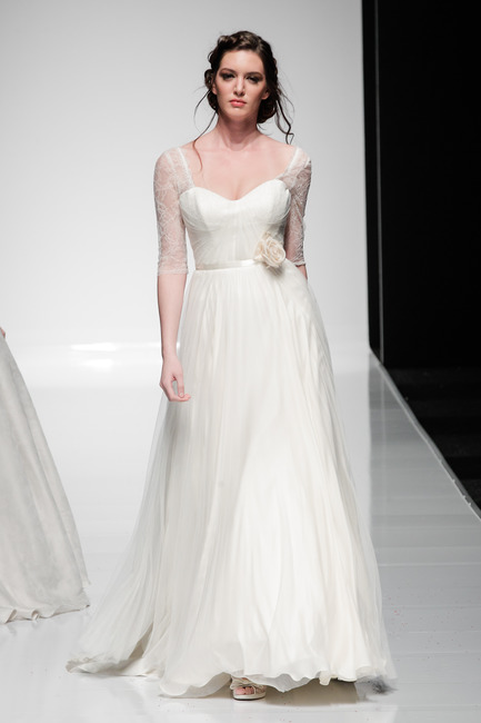 Ecco l'abito da sposa “Esme”, in pizzo Chantilly, con sottile gonna in chiffon plisse e fascia in vita con fiore.