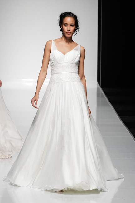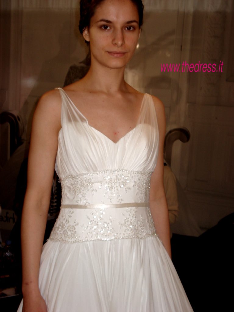 Ecco “April”, delicatissimo abito da sposa drappeggiato in chiffon di seta con vita bassa e spalline morbide.
