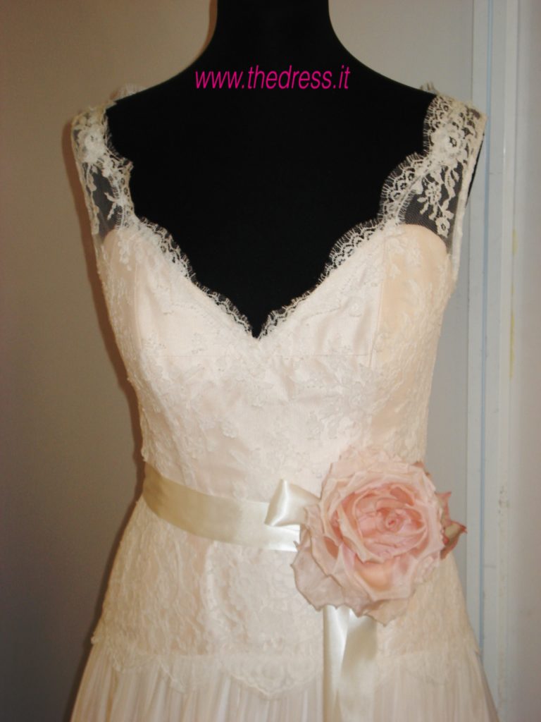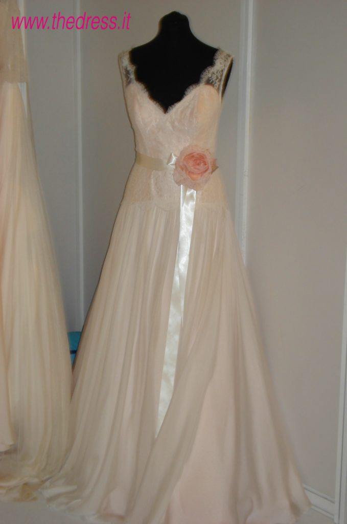 Delicatissimo e femminile l'abito da sposa “Ivy”, tono ostrica, in chiffon di seta con applicazioni in pizzo guipure sul corpetto.
