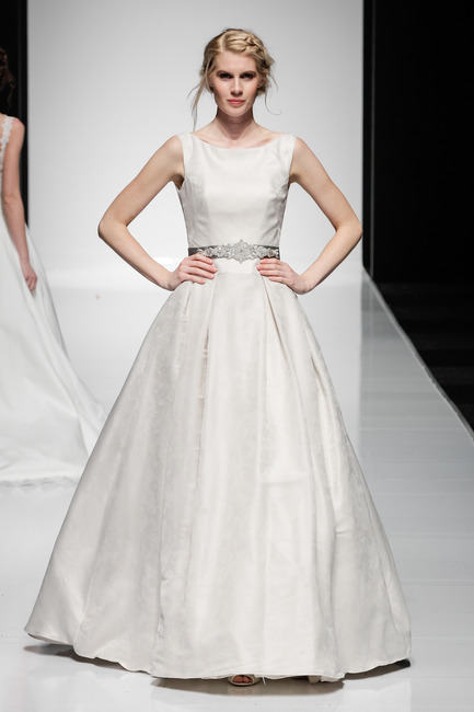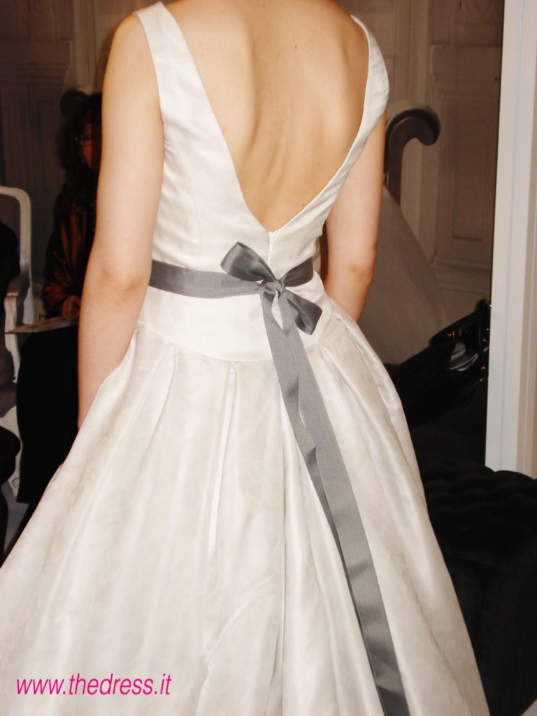 Più strutturato l'abito da sposa “Juniper”, un modello in voile di seta jackard in tonalità grigio colomba, con scollo a barchetta, scollatura profonda a V e cintura in grigio scuro abbellita da ricami lucenti.
