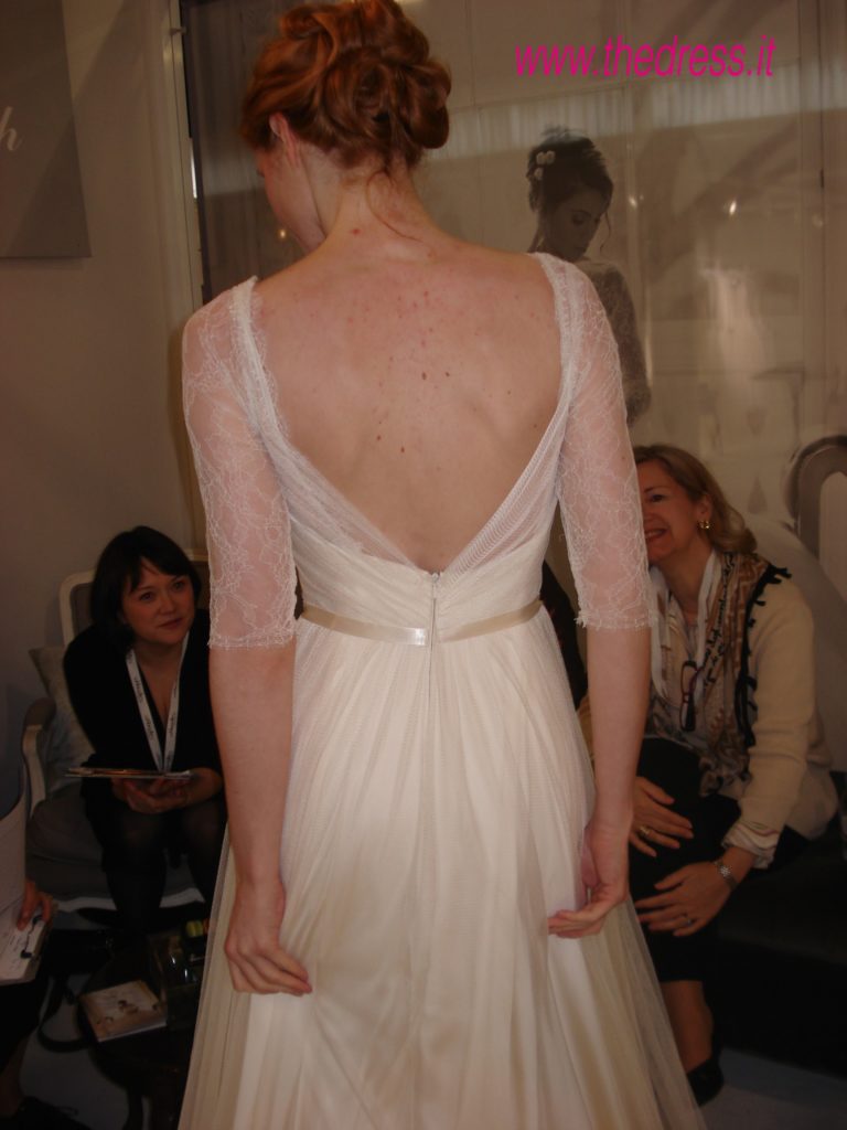 Molto morbido anche l'abito da sposa “Bluebell”, sempre in chiffon di seta, con dettagli in vita in pizzo dipinto a mano e paillettes e spalline velate in chiffon.