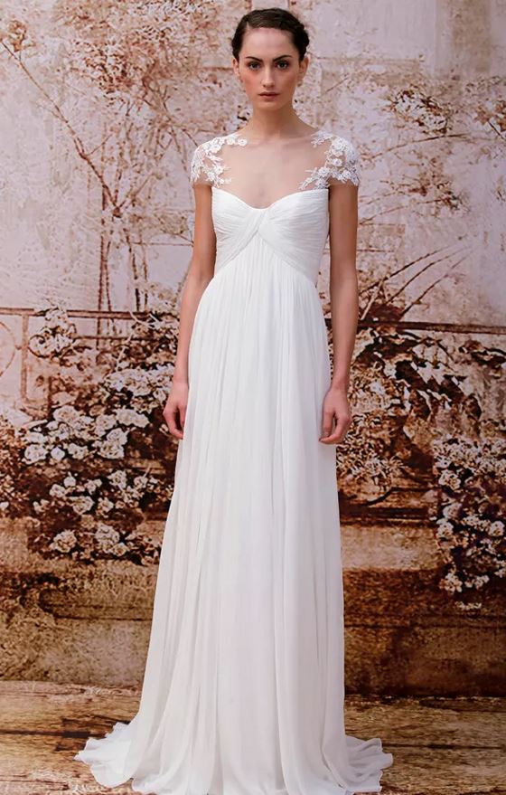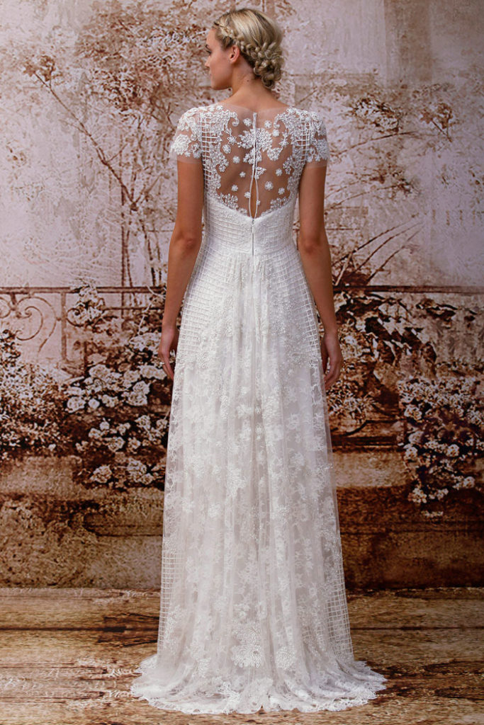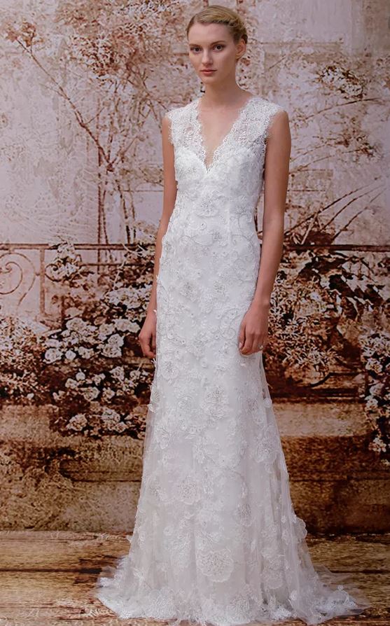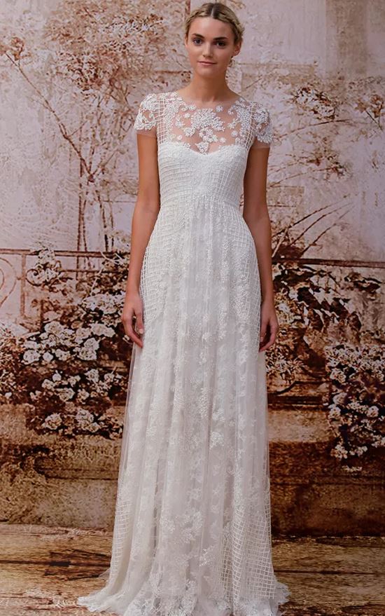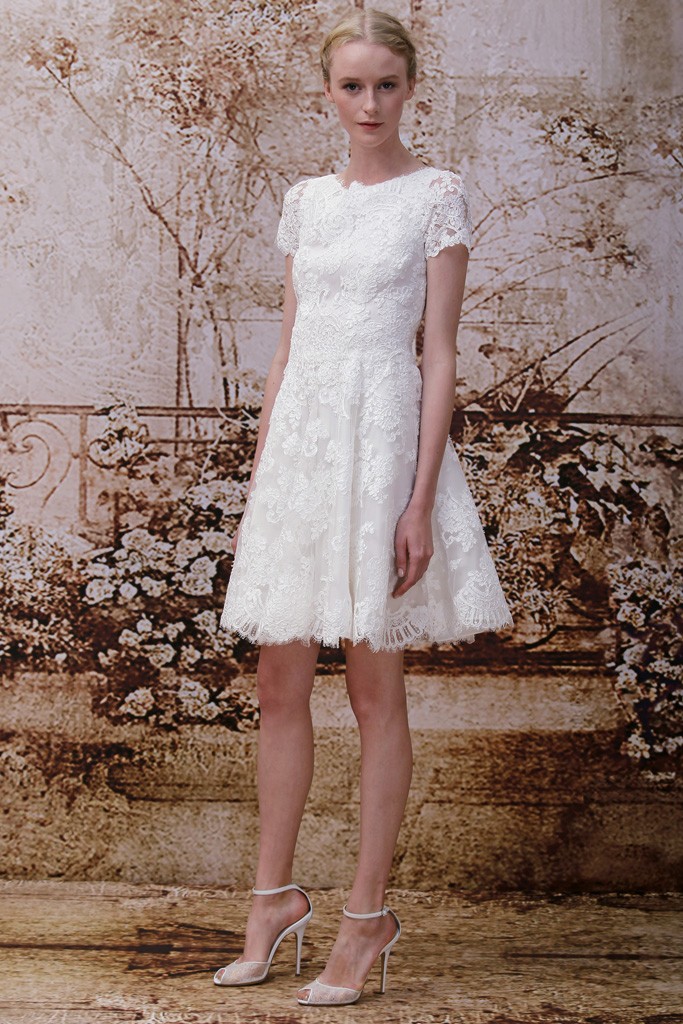 La collezione sposa Monique Lhuillier Fall 2014 si apre con alcune proposte di abito da sposa corto: dal semplicissimo tubino, ai modelli con scollo a illusione in pizzo e gonna a palloncino, aggiungendo via via pizzo fino ai cocktail dress interamente in pizzo con scollo a cuore, davvero un punto fermo della stilista.