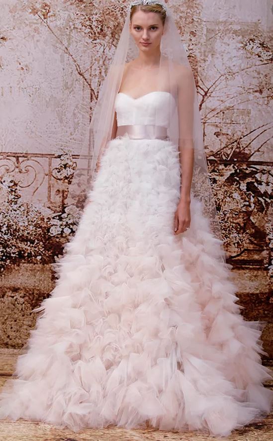 Tra questi anche un abito da sposa rosa cipria con nastro in raso abbinato, chiuso sul retro da spilla in cristalli.