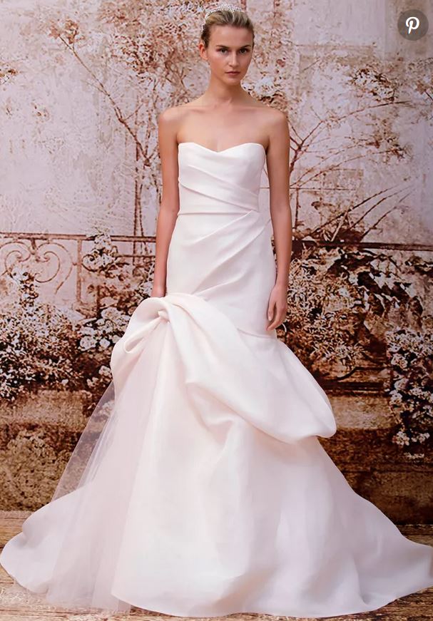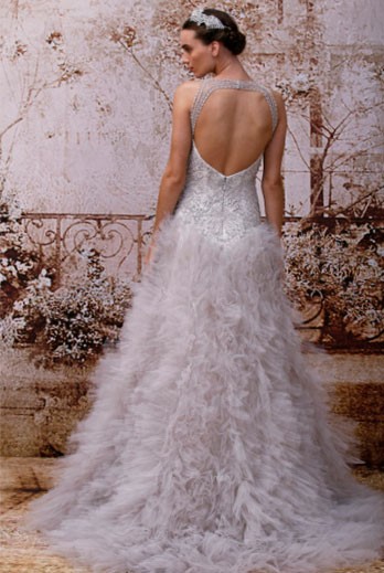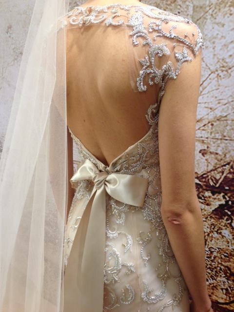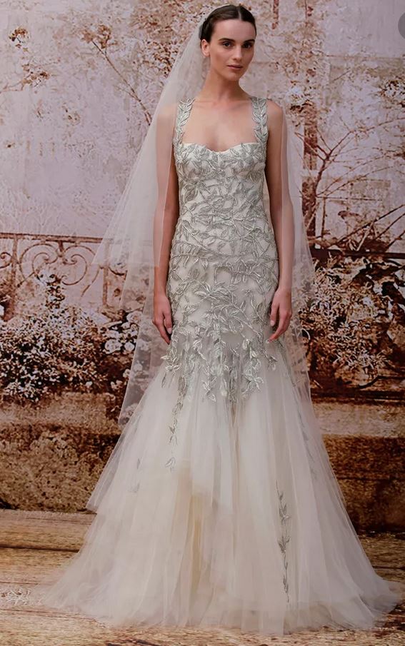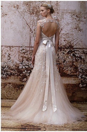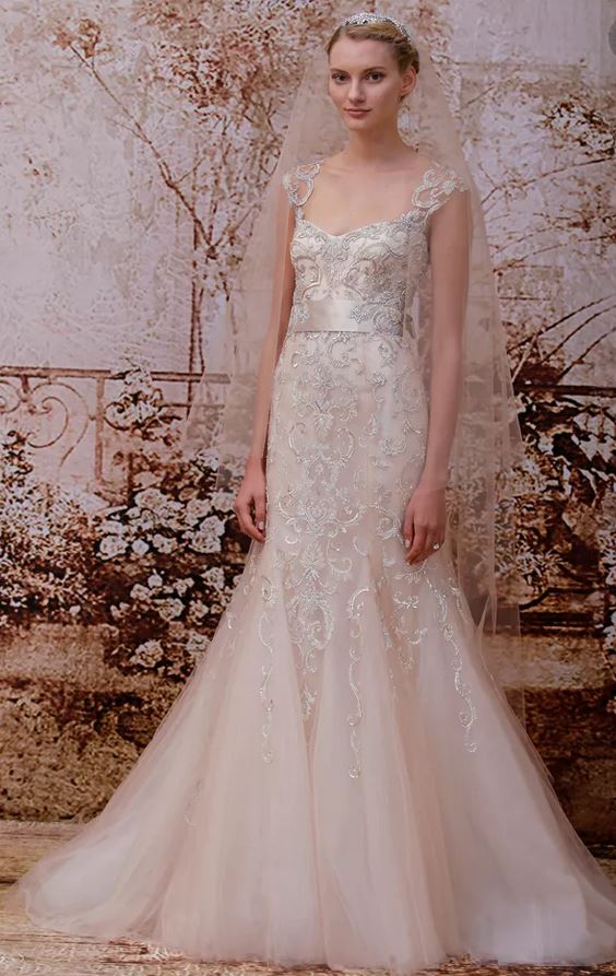 Oltre al ricamo floreale, Monique Lhuillier propone anche abiti da sposa con ricami in cristalli su abiti da sposa anche color panna e rosa cipria dalla linea svasata.