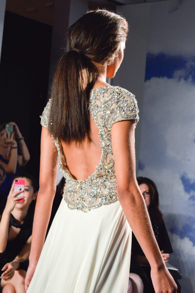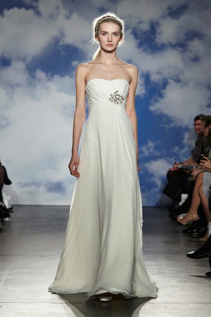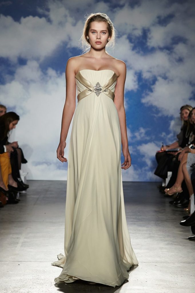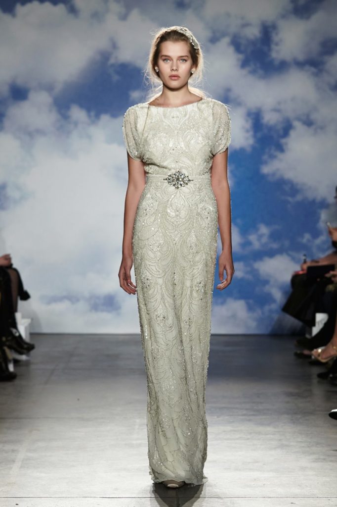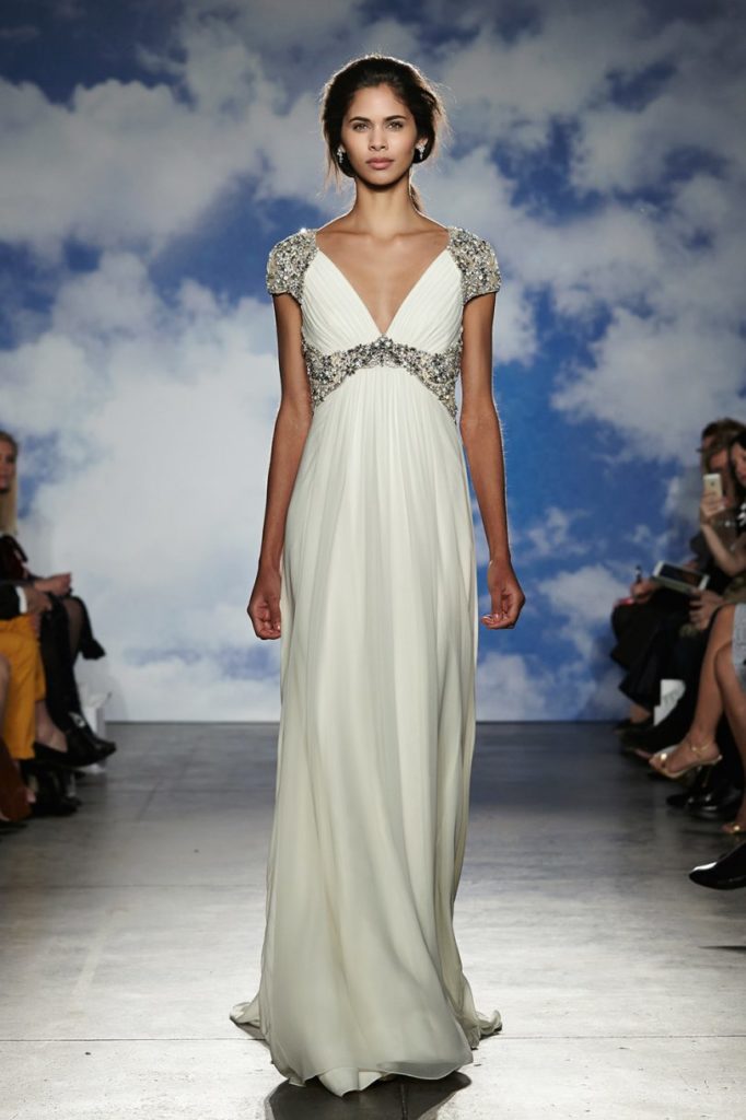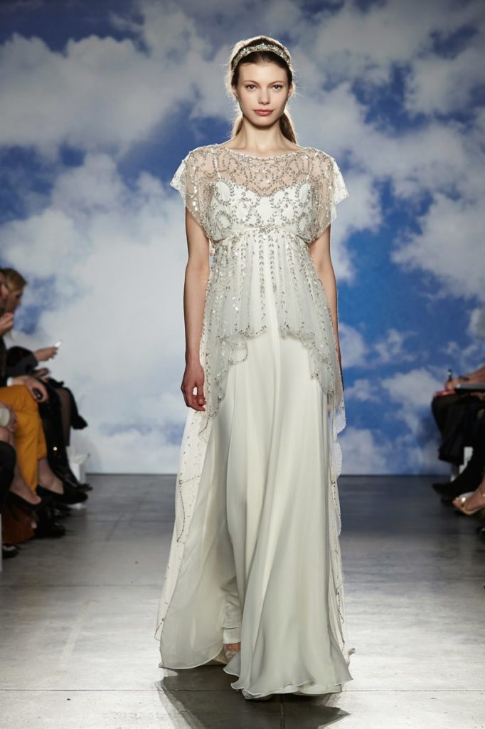Molti modelli della collezione sposa Jenny Packham Spring 2015 hanno dettagli gioiello sul corpetto o in vita.