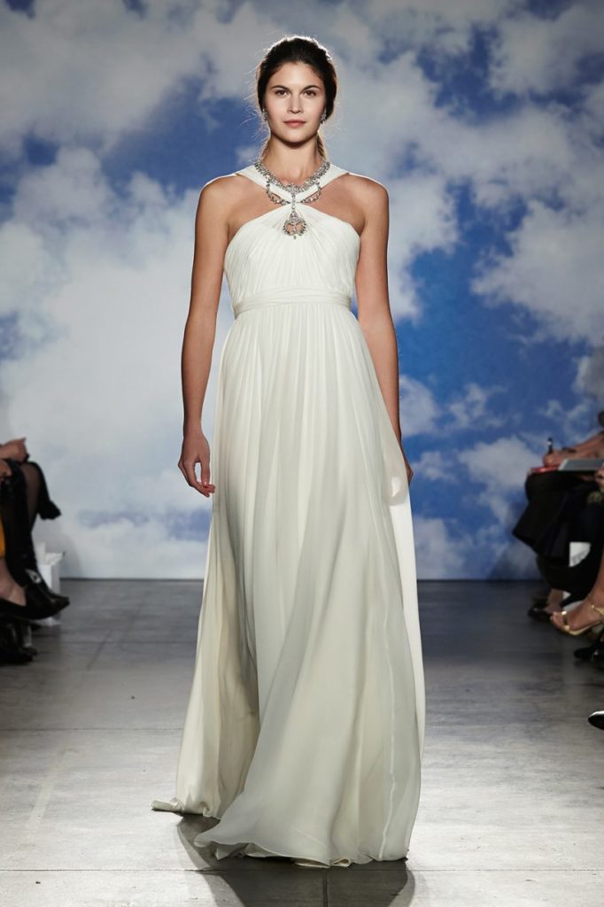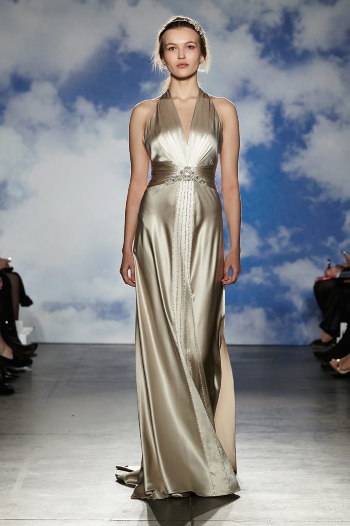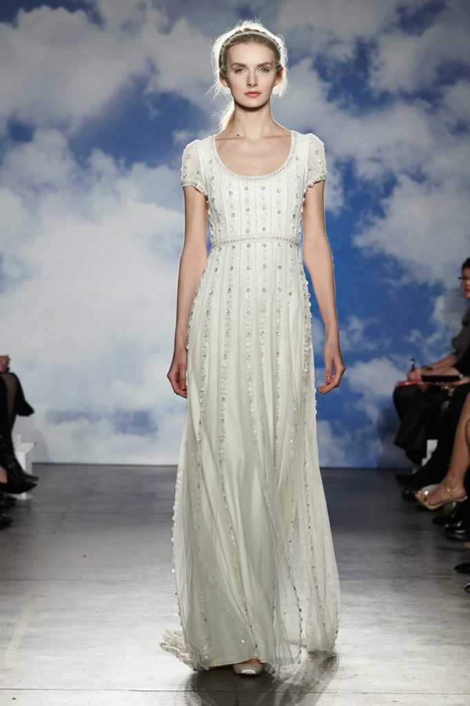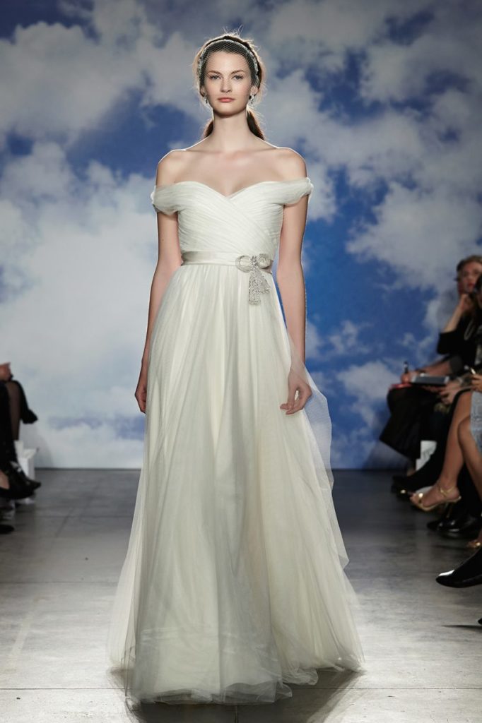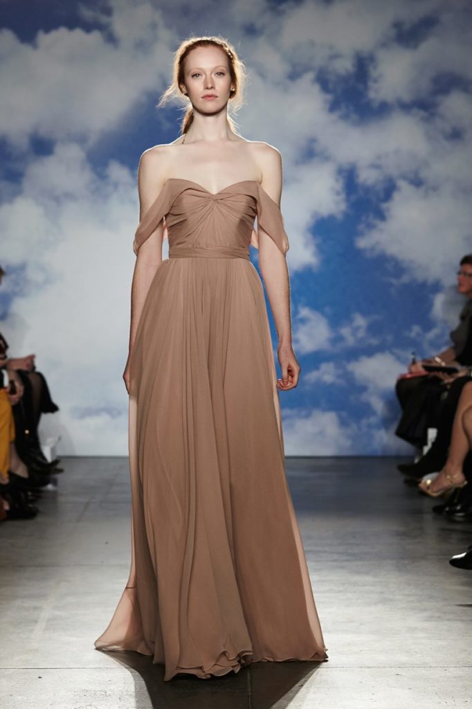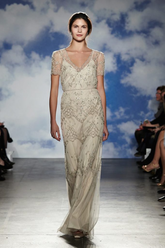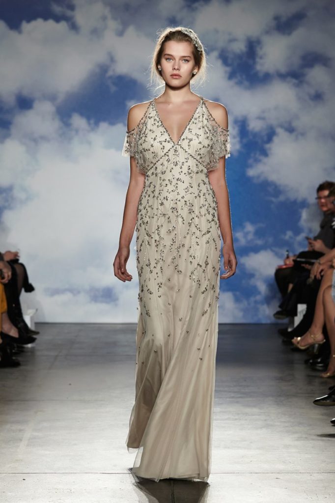 Nella collezione sposa Jenny Packham Spring 2015, diversi gli abiti da sposa che, con diverse varianti stilistiche, lasciano scoperte le spalle.