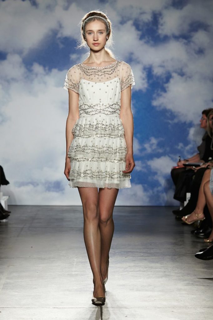 Presenti anche alcune proposte di abito da sposa corto, sopra o sotto al ginocchio, con velatura e fitti ricami.