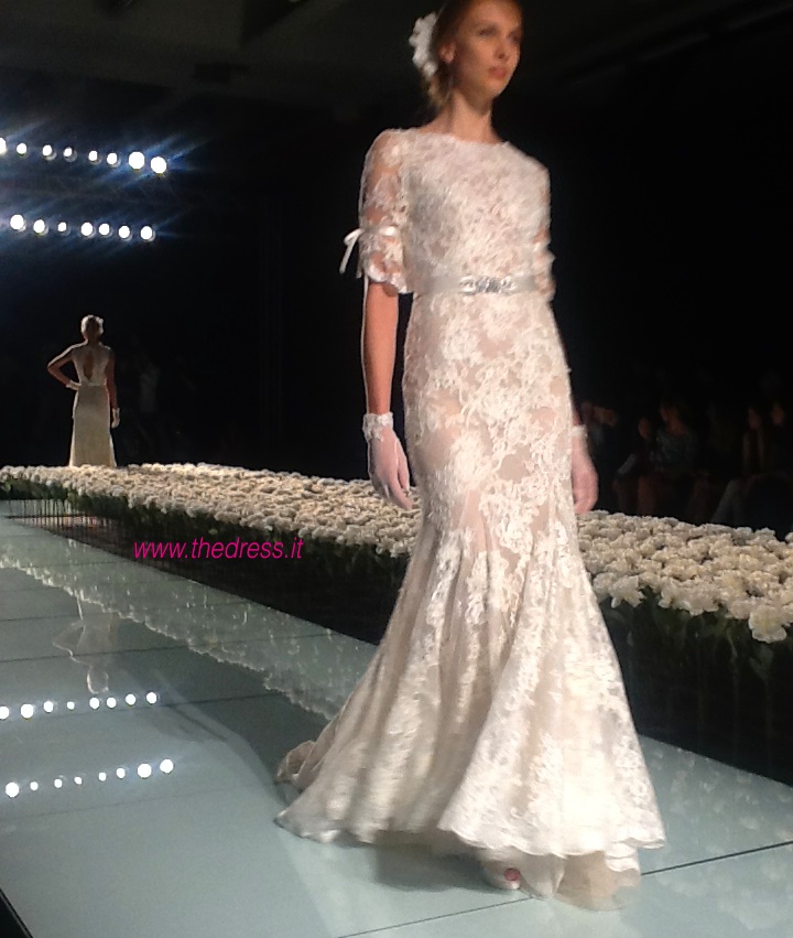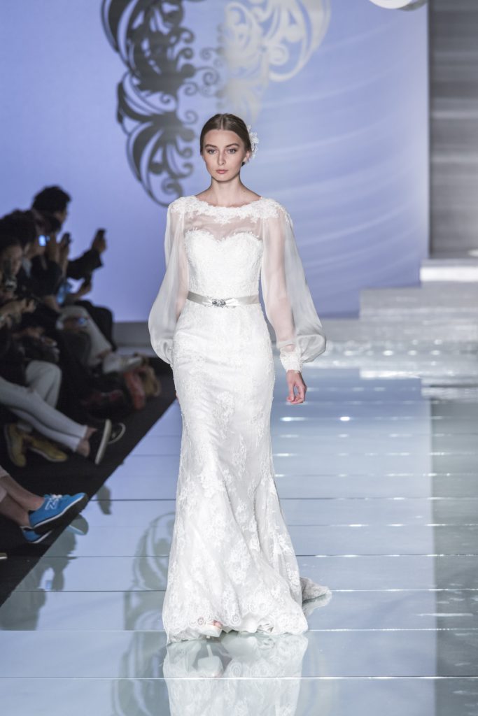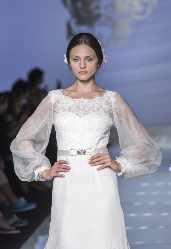 Nella collezione sposa Lusan Mandongus 2015, molti gli abiti senza maniche o con maniche lunghe, anche a sbuffo.