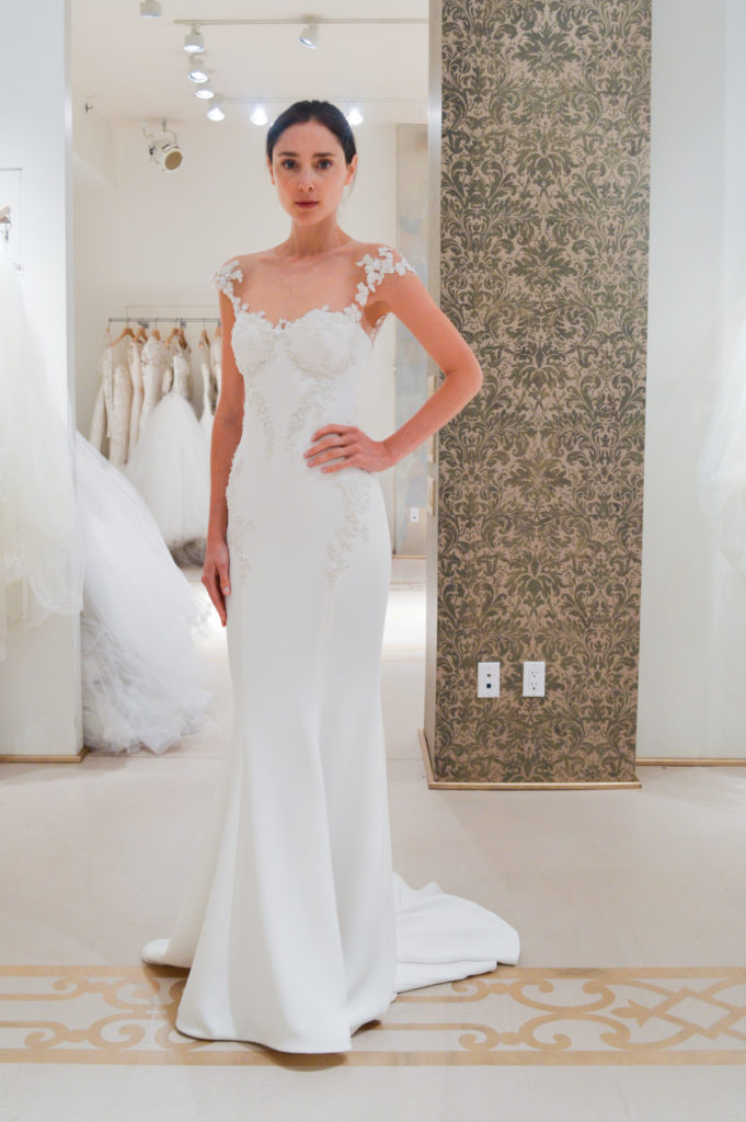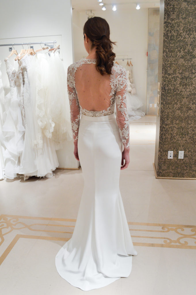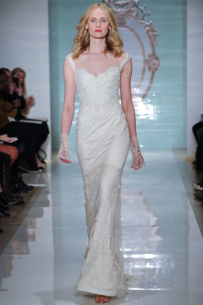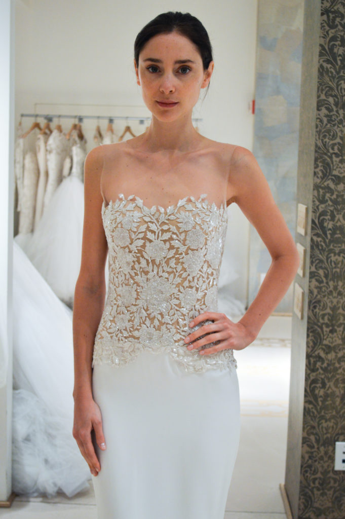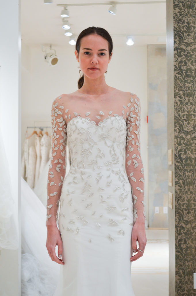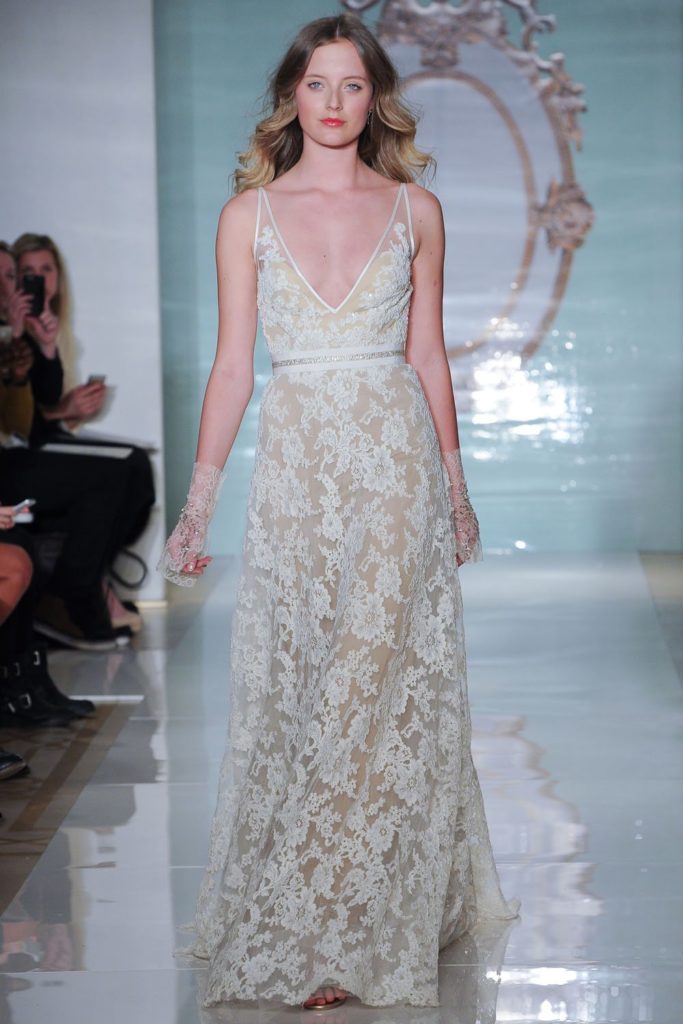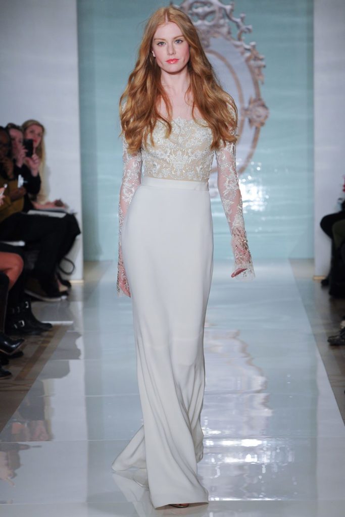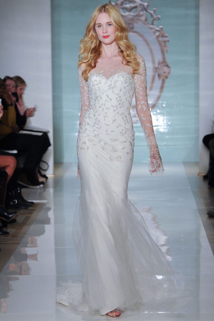 La collezione sposa Reem Acra Spring 2015 propone anche abiti dal corpetto velato in pizzo con maniche lunghe.