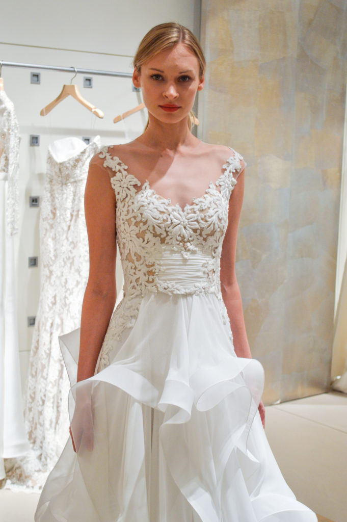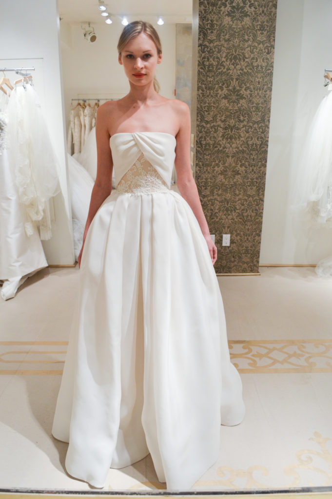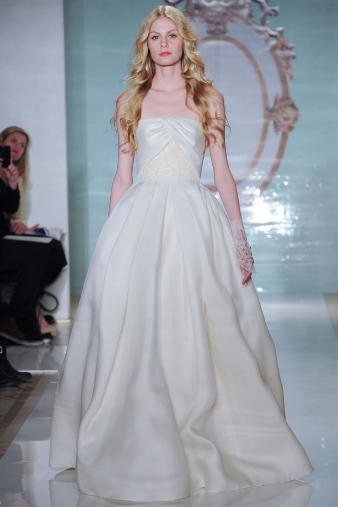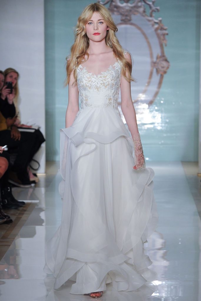 Molto romantici dalla collezione sposa Reem Acra Spring 2015 gli abiti da sposa A-line in pizzo e organza di seta, senza spalline, o con spalline corte, con strati di tulle.