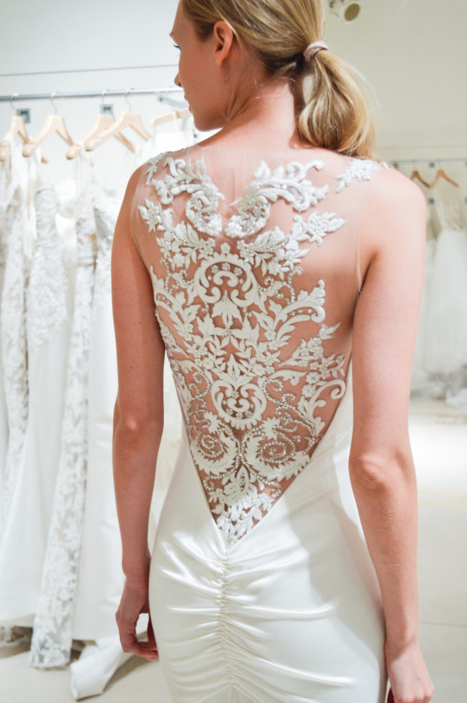 A sirena, l'abito in satin con corpetto ricamato, scollo a illusione ed una fantastica schiena velata ricamata, effetto tatuaggio.