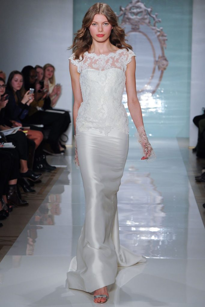 Ricordando la splendida collezione sposa Reem Acra Fall 2014, la collezione sposa Reem Acra Spring 2015 chiamata “Mirror, Mirror” propone abiti modulati sull'accostamento tra tessuti diversi, le applicazioni in pizzo, i ricami e i cristalli, su silhouette scivolate, svasate o A-line.