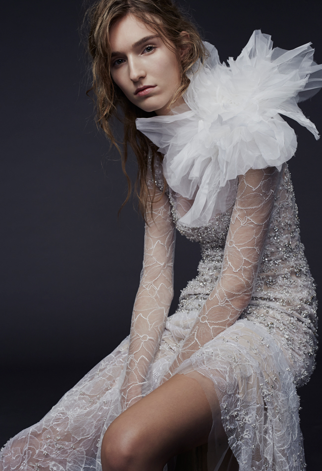 Dimentichiamo l'aria angelica da principessa delle fiabe di Kim Kardashian sposa in Vera Wang o l'aria regale della sposa in Vera Wang Victoria Beckham, e tuffiamoci in una nuova collezione “sexy, sensuale, giovane, cool e ricamata”, per usare le parole della stilista.