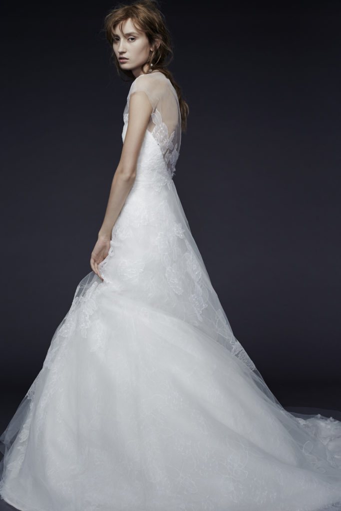 Dalla collezione sposa Vera Wang Fall 2015, ancora un romantico ballgown, con applicazioni in pizzo Chantilly, con scollo a negligee, cristalli e fiori in organza.