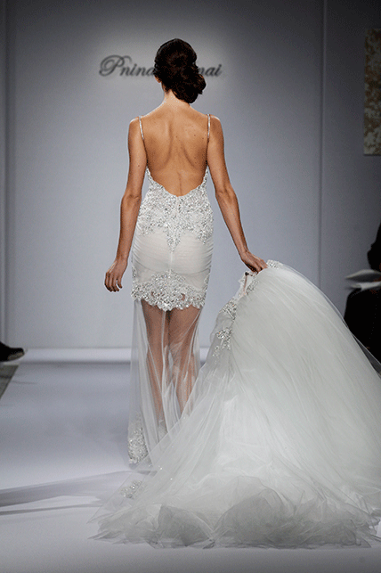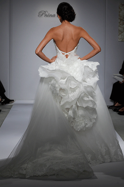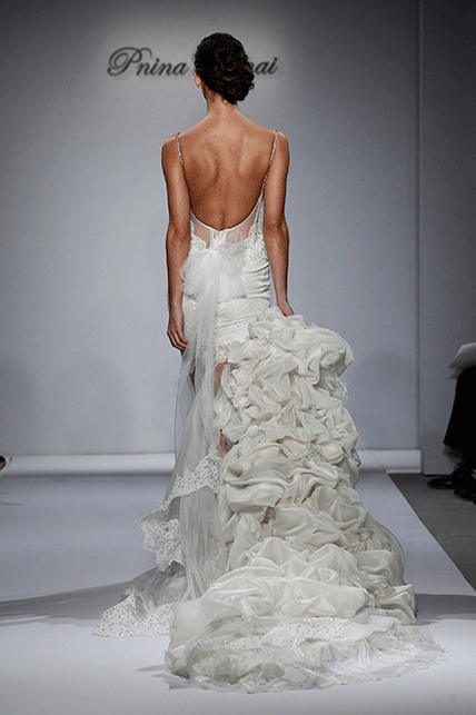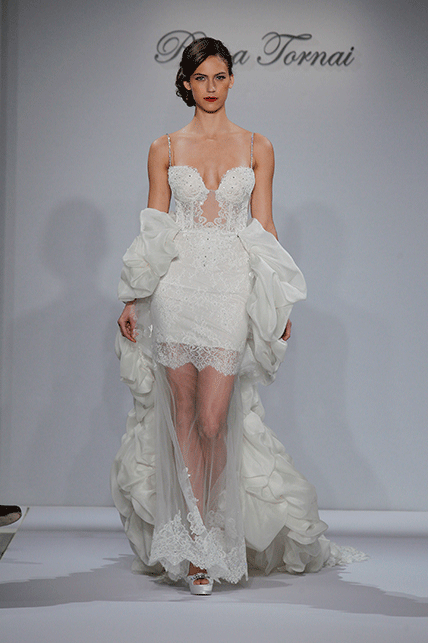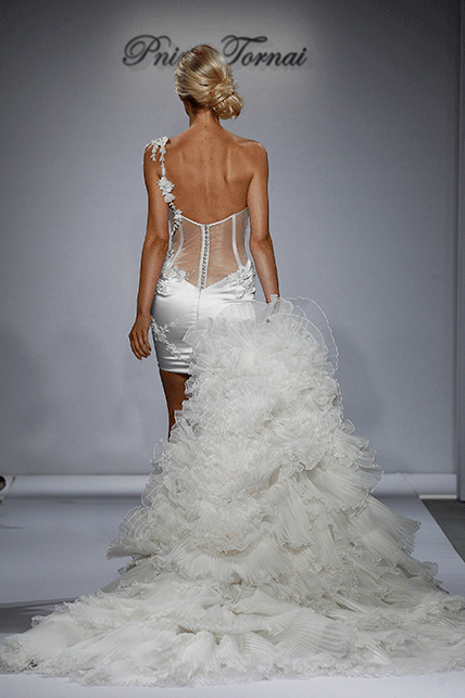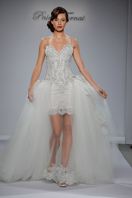 Nella collezione sposa Pnina Tornai 2015 sono infatti presenti molti elementi staccabili, come lo strascico (o parte della coda) o la gonna, così da proporre diversi abiti da sposa componibili.