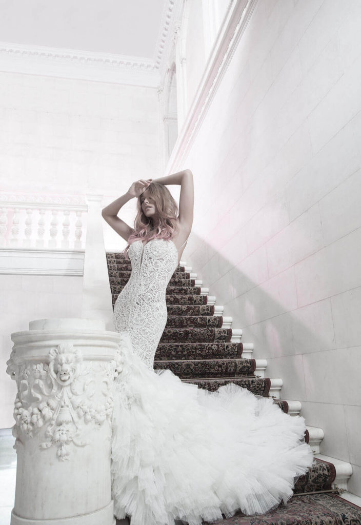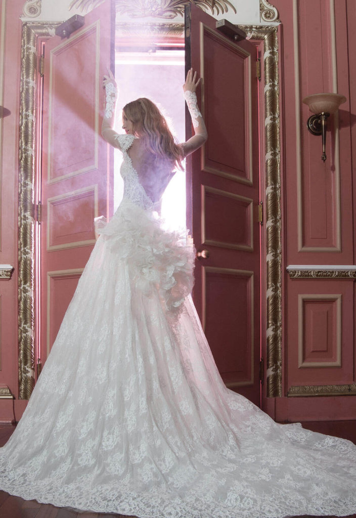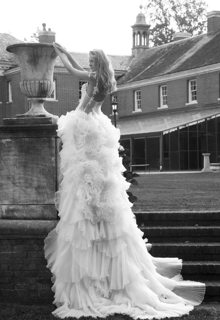 Ed ecco, dunque, tutti gli elementi dello stile Pnina ritrovarsi nell'abito da sposa con prezioso bustino ricamato e gonna con balze in tulle e pizzo, abbinato a bolero con maniche a farfalla.
