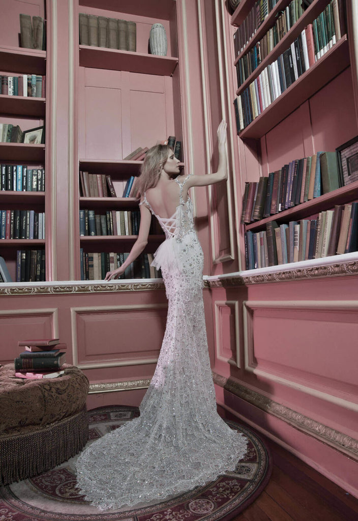 I complessi motivi delle ali delle farfalle ispirano i ricami e i disegni simmetrici abbinati a seducenti pannelli trasparenti, in questa collezione sposa Pnina Tornai 2015.