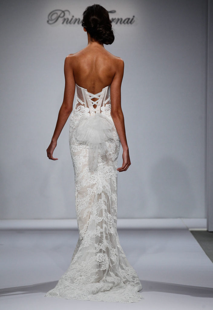La collezione sposa Pnina Tornai 2015 esalta le forme, proponendo abiti da sposa bustier in opulenti pizzi Chantilly e arricchiti da meticolosi ricami a mano e cristalli.