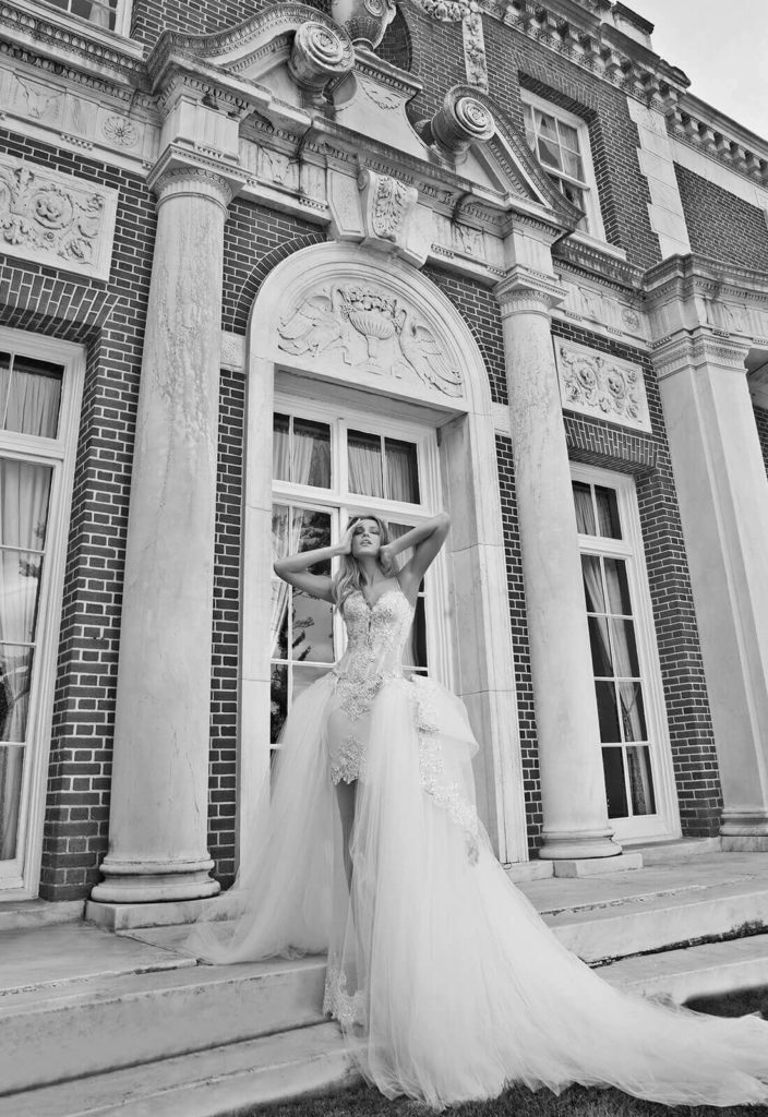 Trionfo di pizzi e cristalli svarowski per gli abiti da sposa a colonna davvero abbiaglianti, arricchiti da ricami per un effetto sensuale e glam tipico di Pnina Tornai.