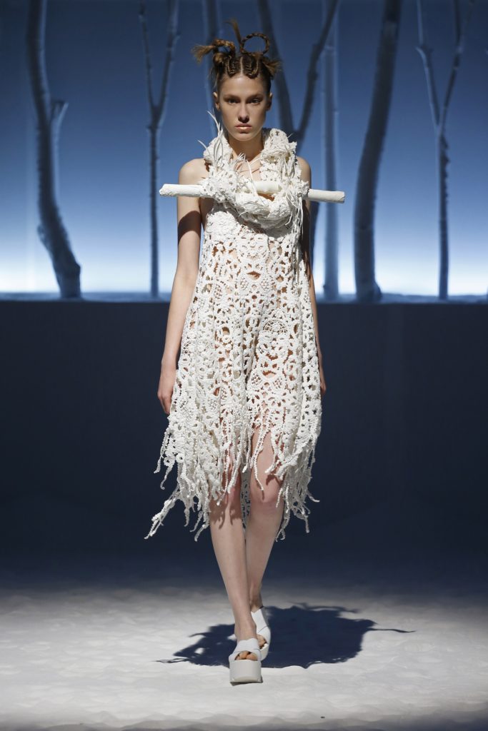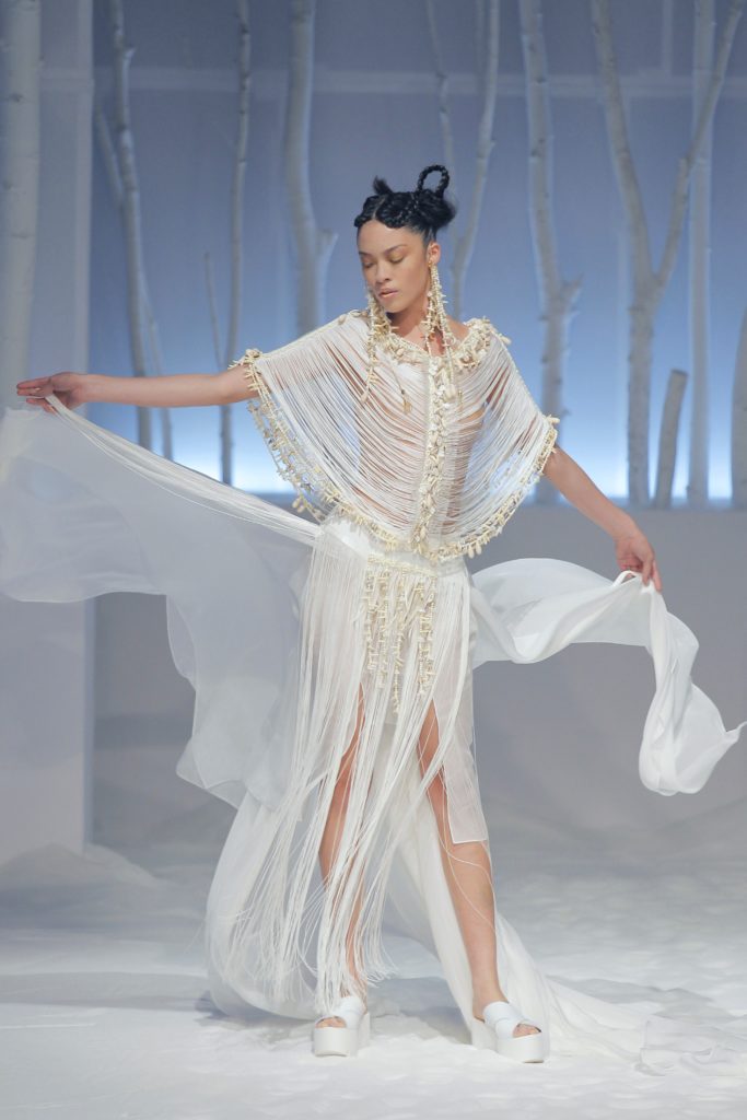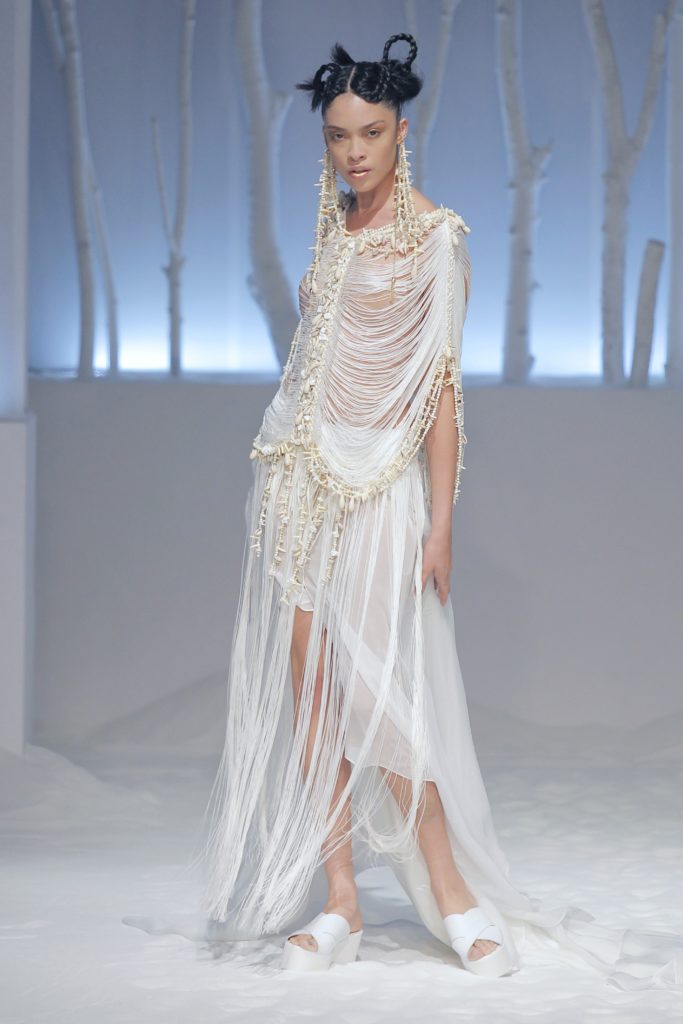 In chiusura di sfilata, torna il tema afro con alcuni modelli con fili di perline, perle e conchiglie.