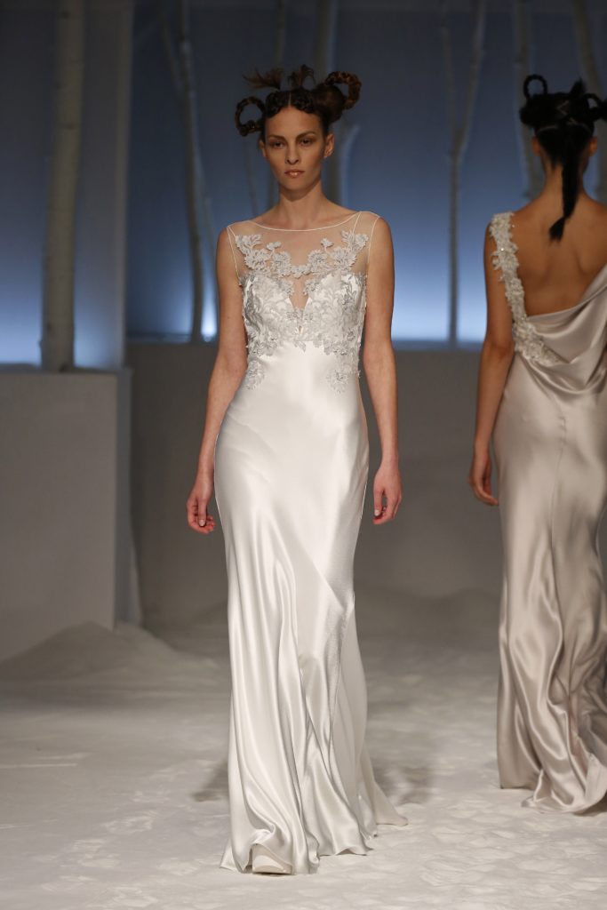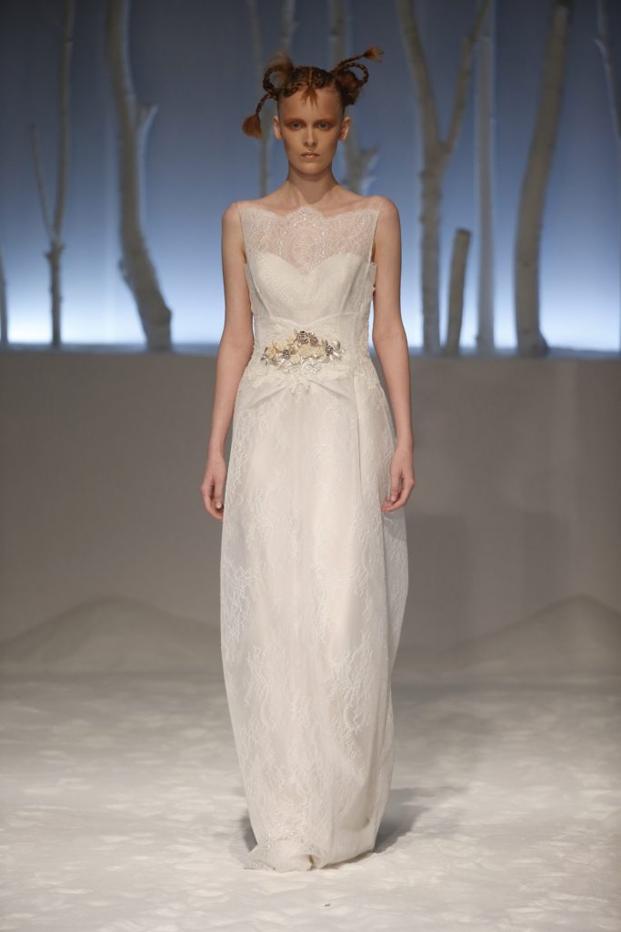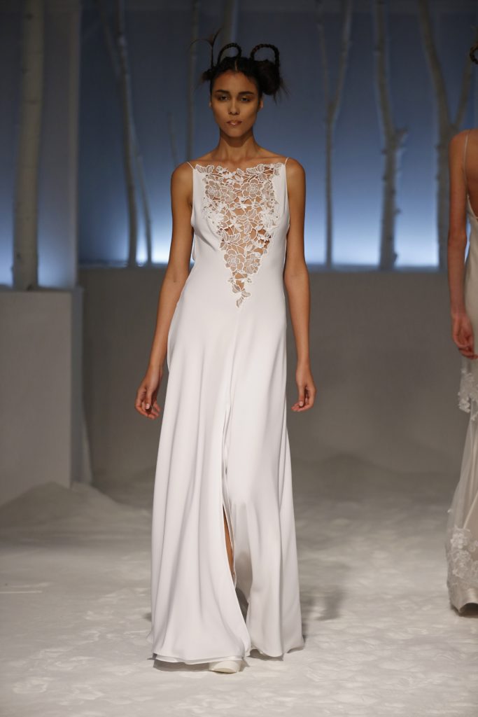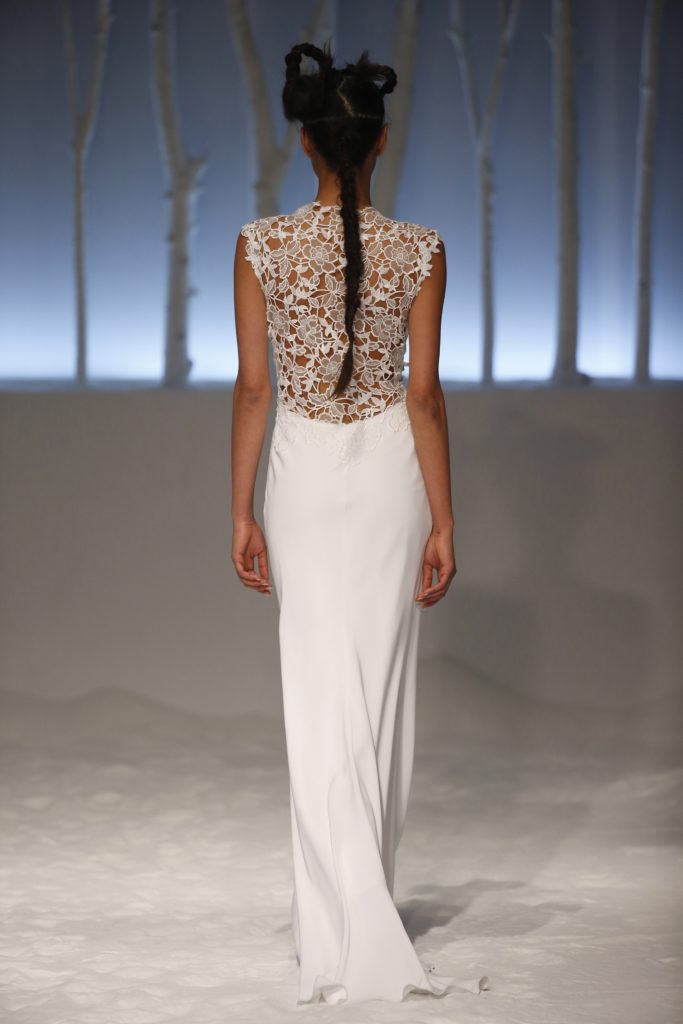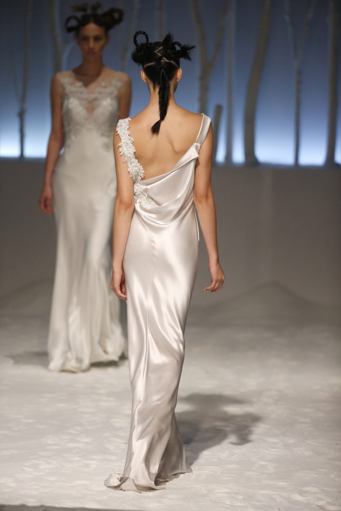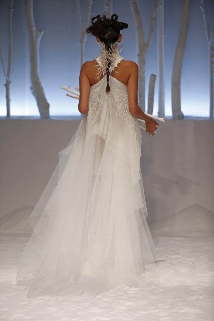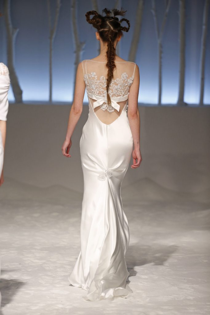 Molti i modelli con scollatura velata e dettagli asimmetrici, presentando una sposa impeccabile per certi versi tradizionale ma in grado di rompere gli schemi al punto giusto, con la scelta di materiali o tagli inusuali.