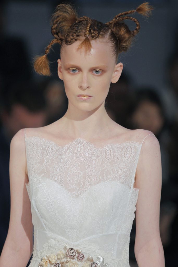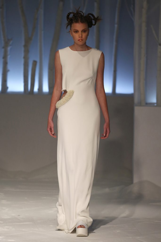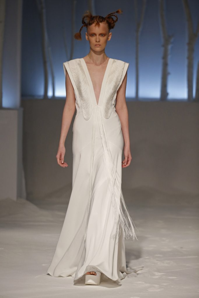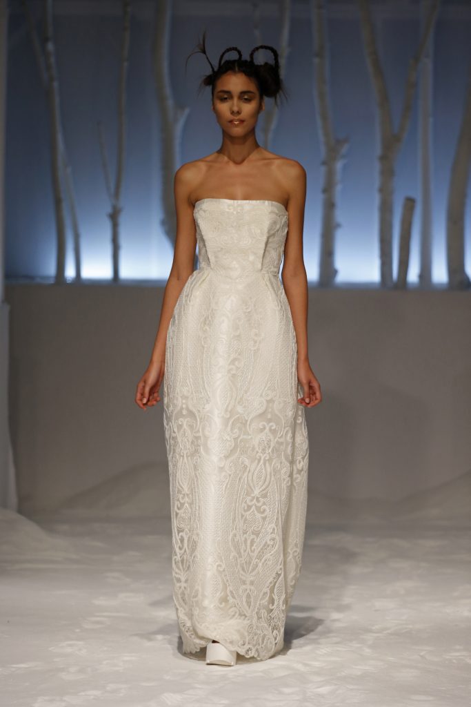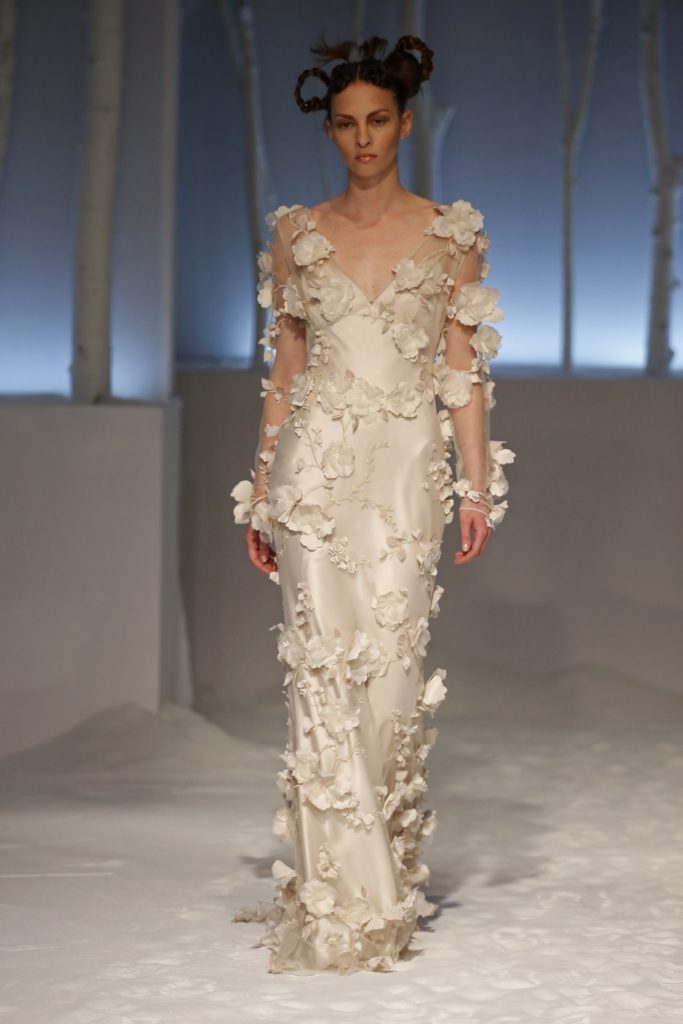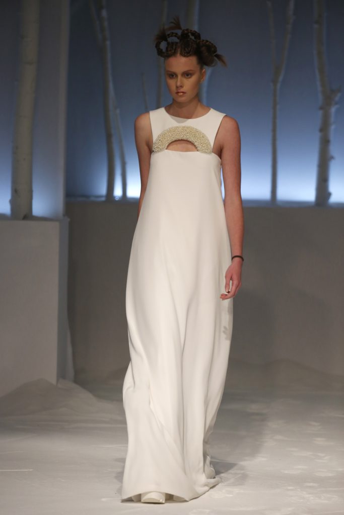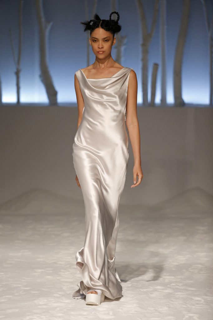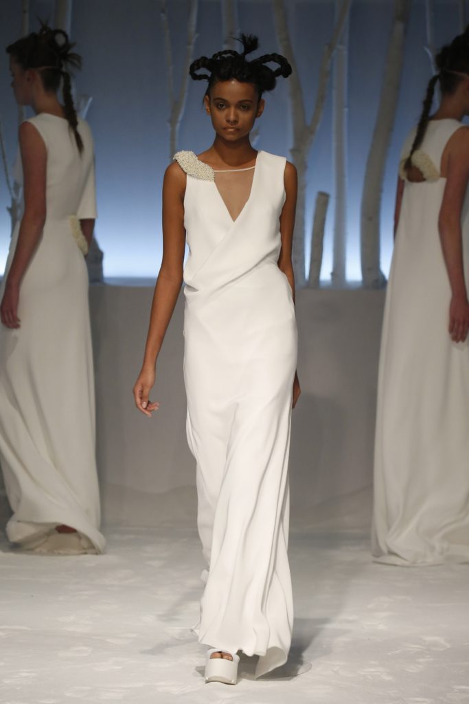 Molti i modelli con scollatura velata e dettagli asimmetrici, presentando una sposa impeccabile per certi versi tradizionale ma in grado di rompere gli schemi al punto giusto, con la scelta di materiali o tagli inusuali.