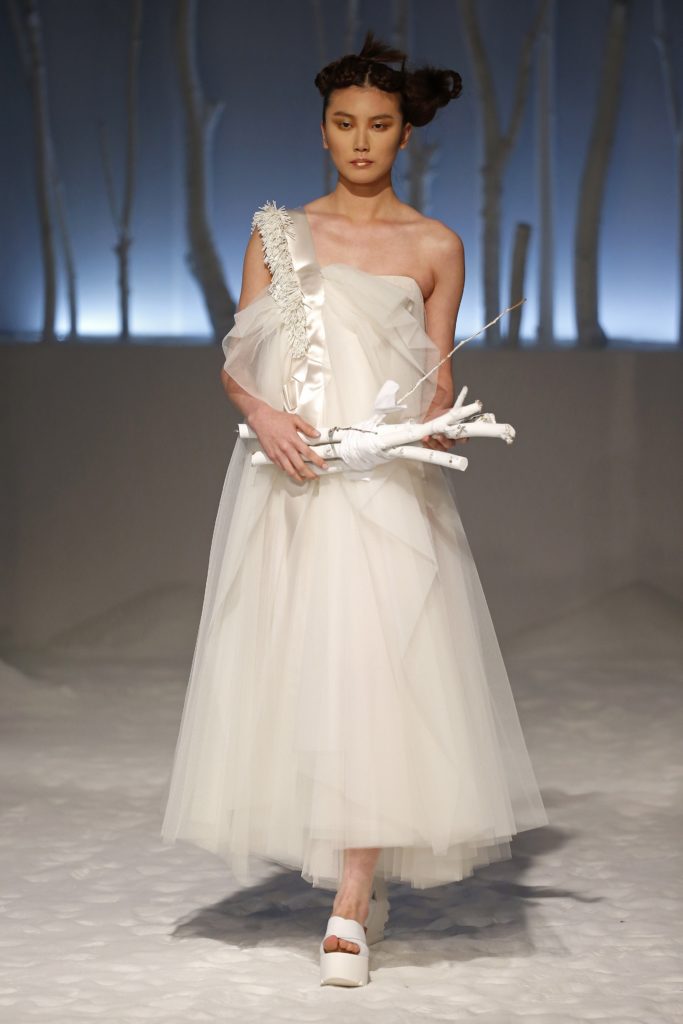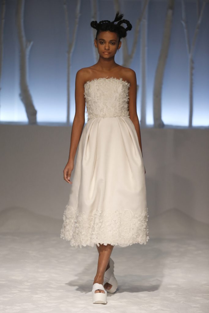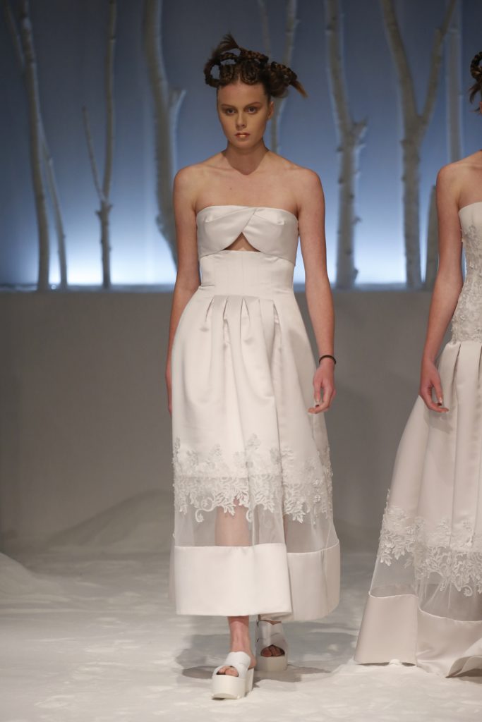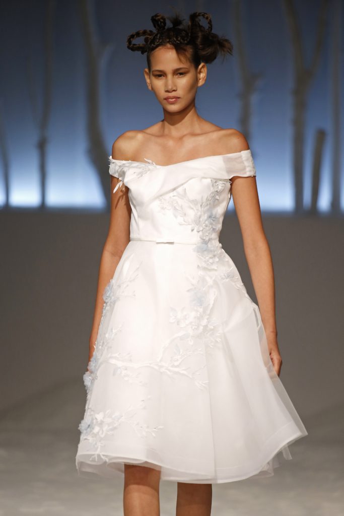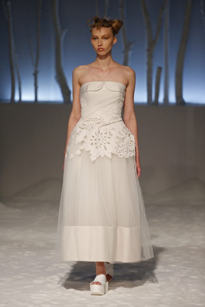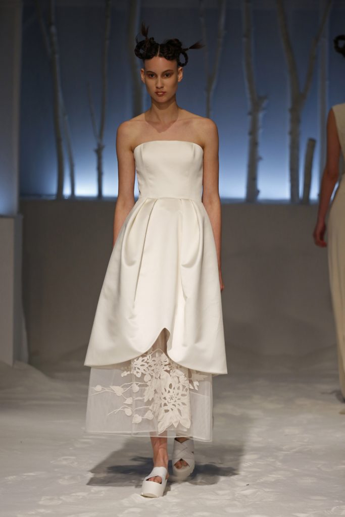 Originali anche gli abiti da sposa dalla doppia lunghezza, in mikado e tulle.