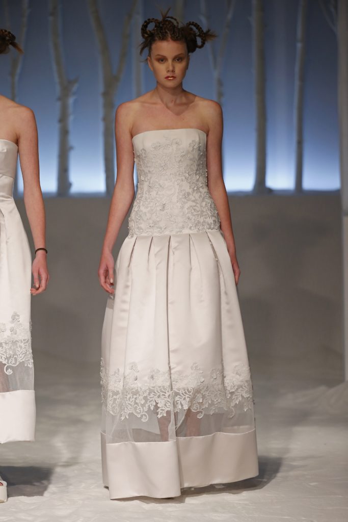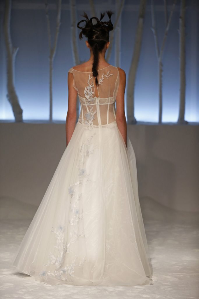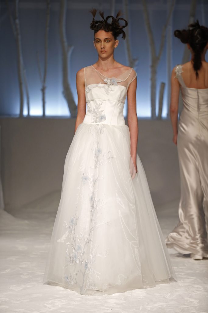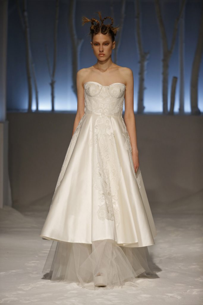 Molti gli abiti da sposa con gonna a palloncino, dalle lunghezze diverse, e abbinati a corpetti dai dettagli originali come aperture o inserti in pizzo.