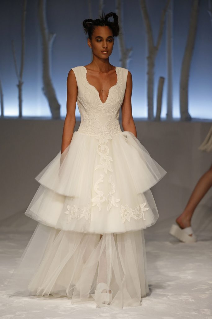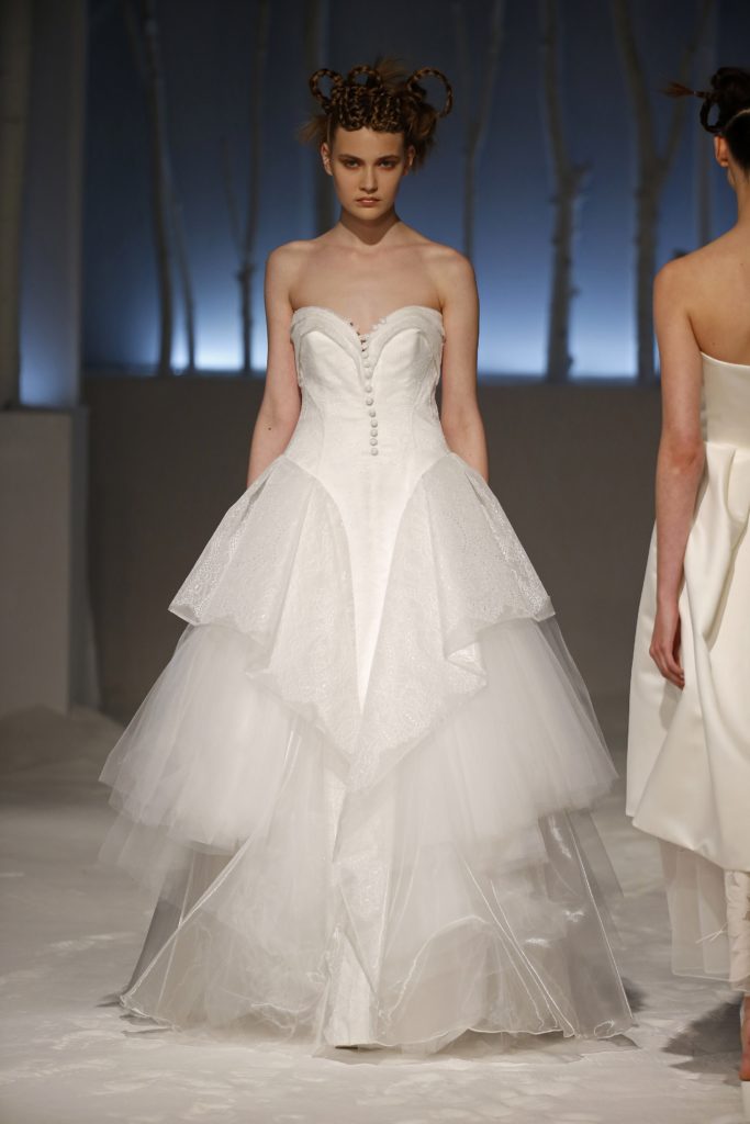 Anche il tradizionale ballgown, l'abito da sposa con gonna ampia scelto dalle spose più romantiche, viene rivisitato con balze e corpetti asimmetrici o in lunghezze inusuali.