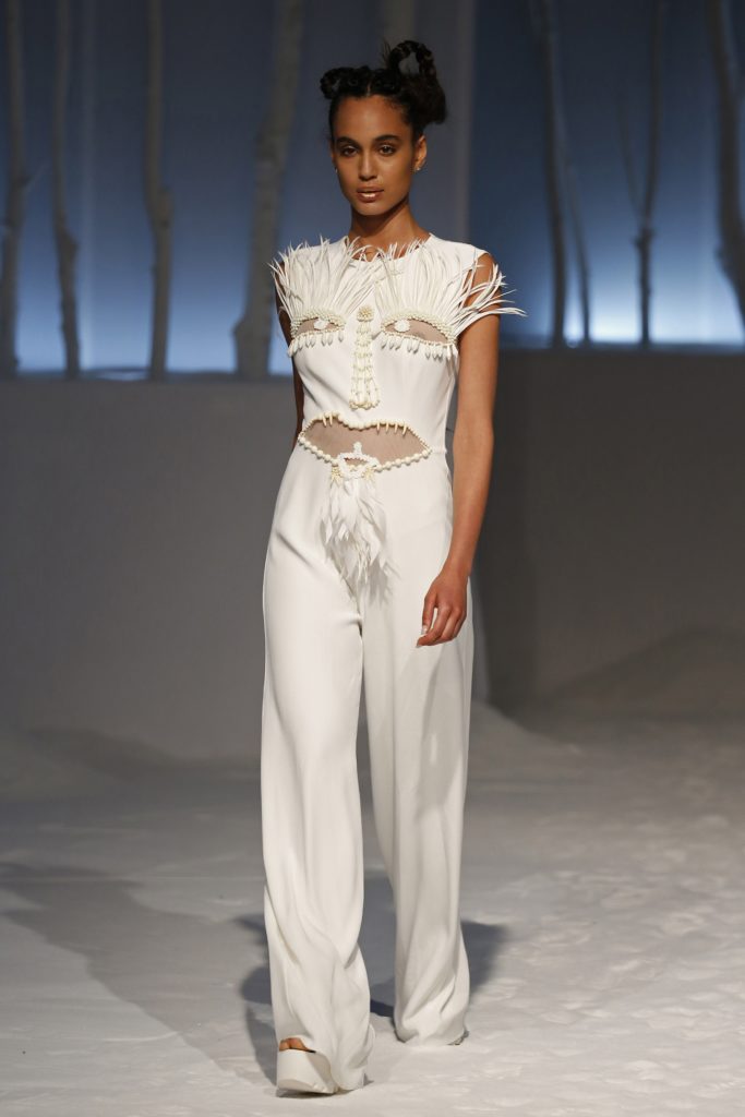 La collezione comprende anche un'originalissima tuta da sposa con dettagli stile afro.