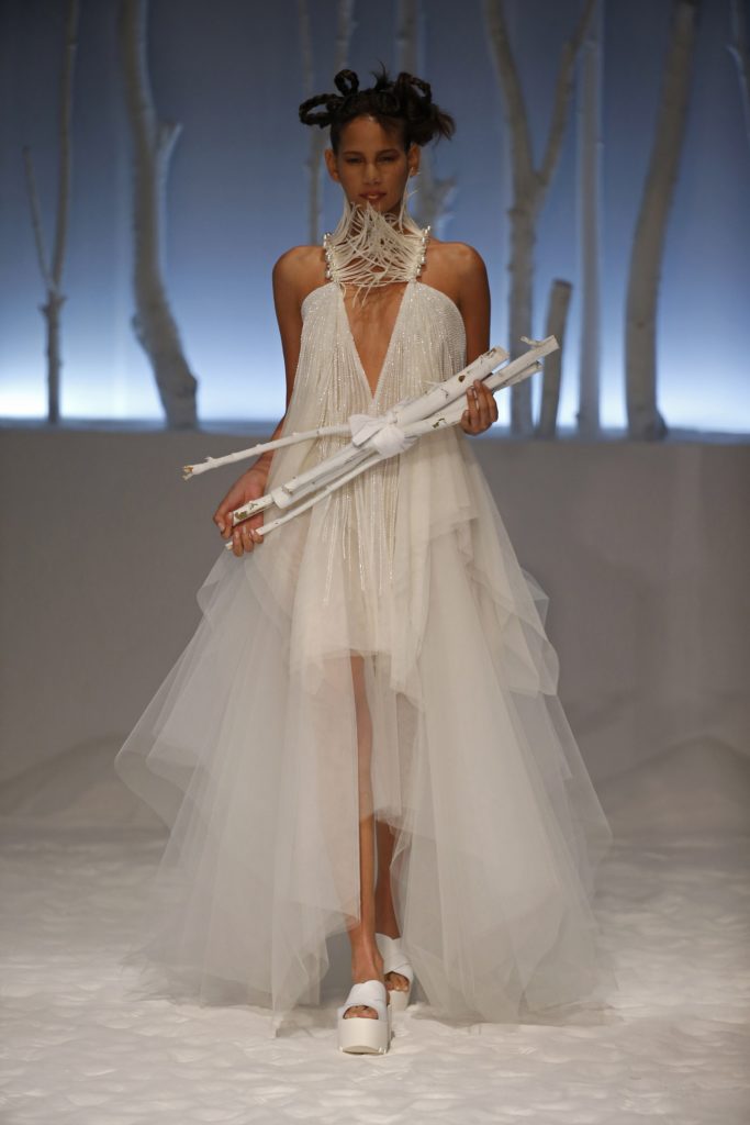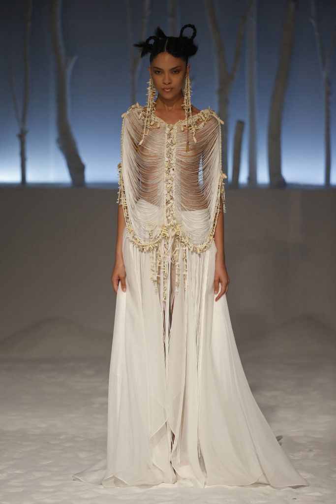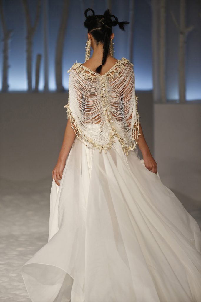 Gli abiti da sposa “di questa poetica e colta collezione presentata in chiave etno-romantica, ci invitano ad una lettura più profonda e a cogliere quanta cultura può esserci dietro a questo mondo”, spiega ancora il brand.