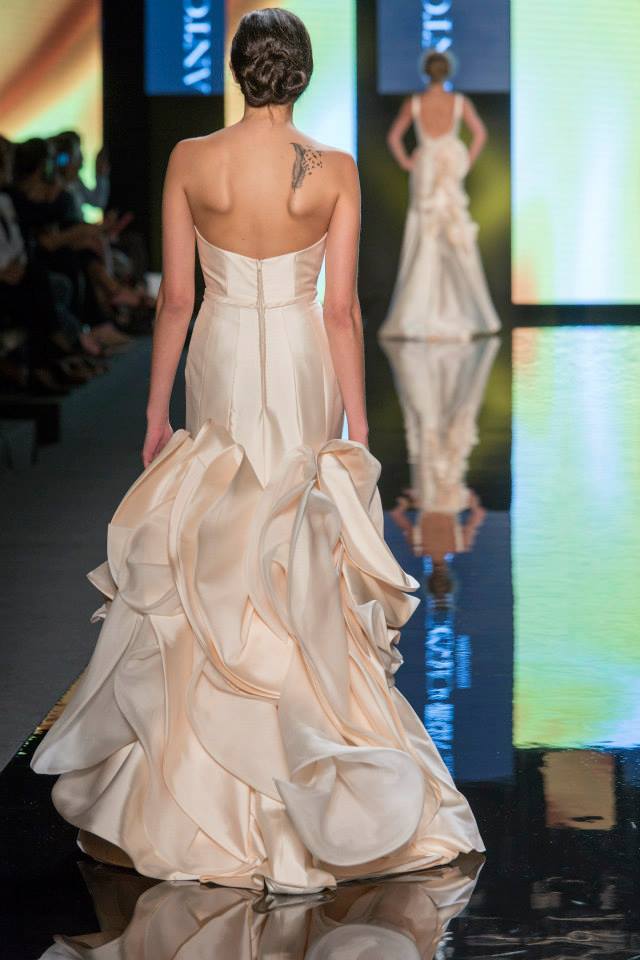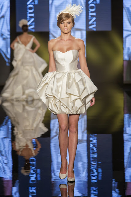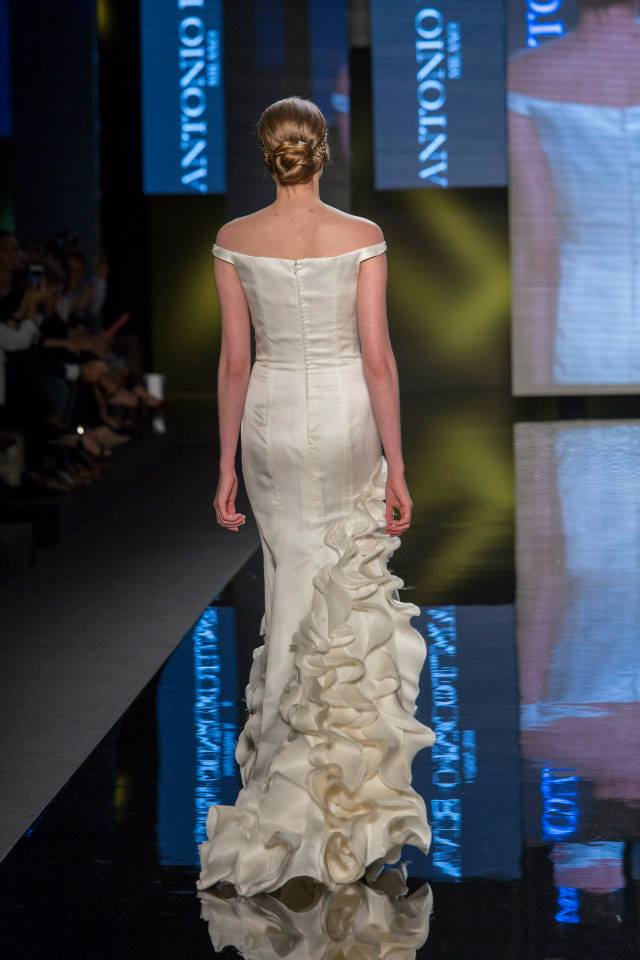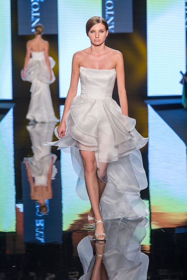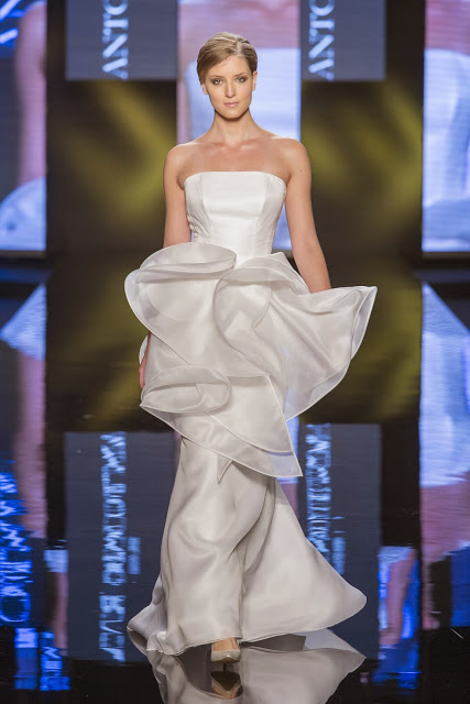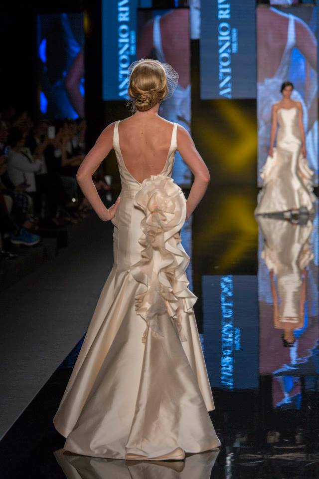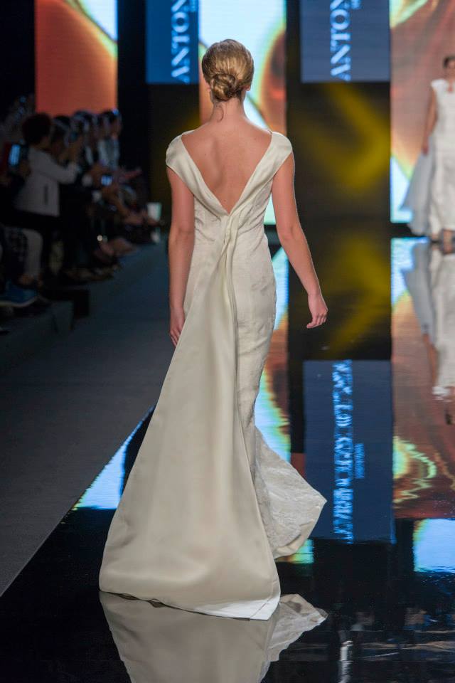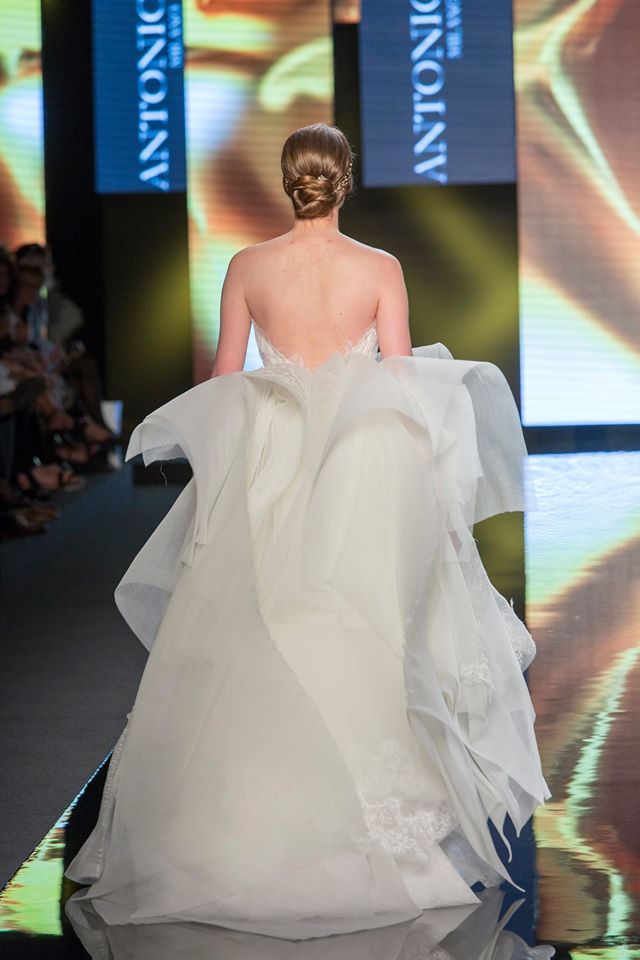 Il mikado è come sempre protagonista, anche di questa collezione sposa Antonio Riva 2016, tessuto ideale per dare forma alle architetture equilibrate e alle asimmetrie volumetriche delle gonne anche dell'abito da sposa corto e delle inconfondibili code di questa collezione presentata in anteprima a Si Sposaitalia 2015.