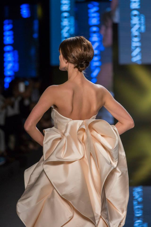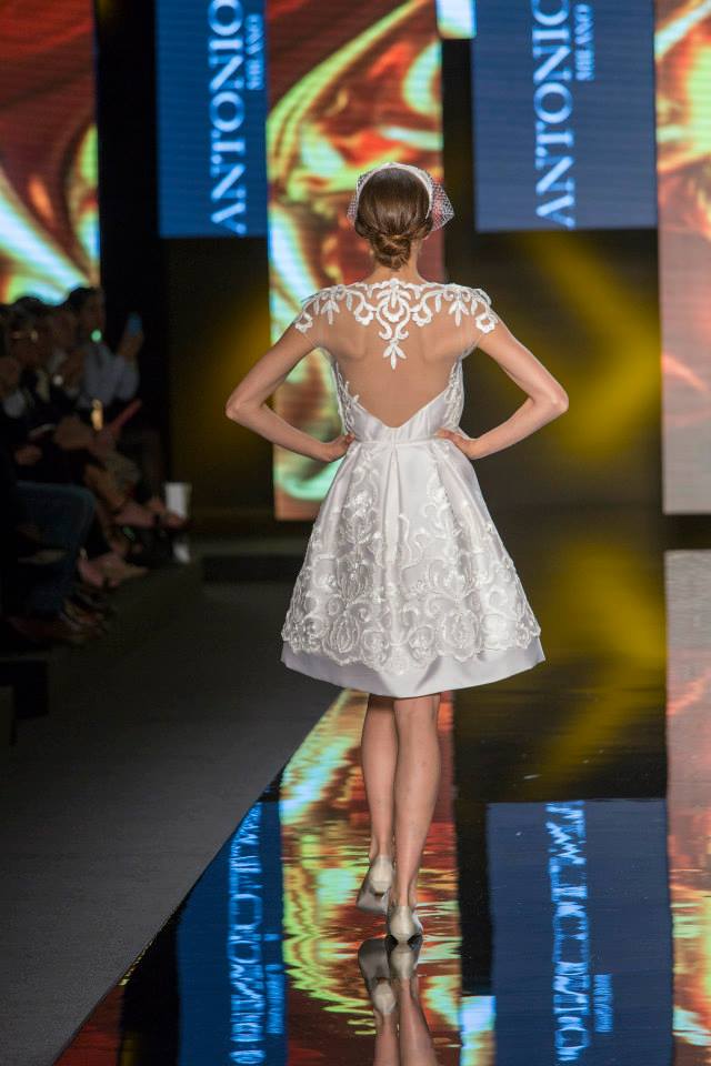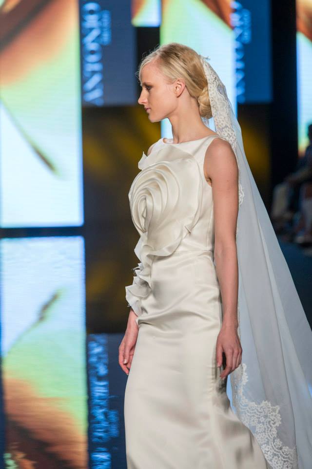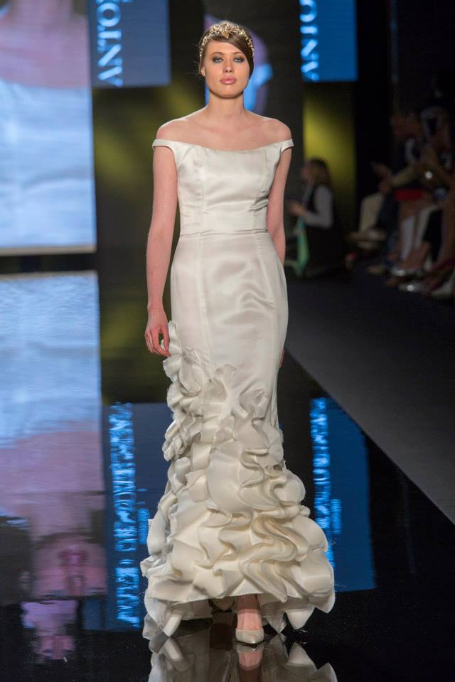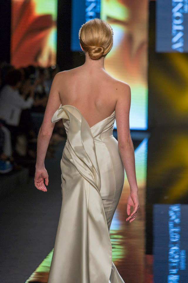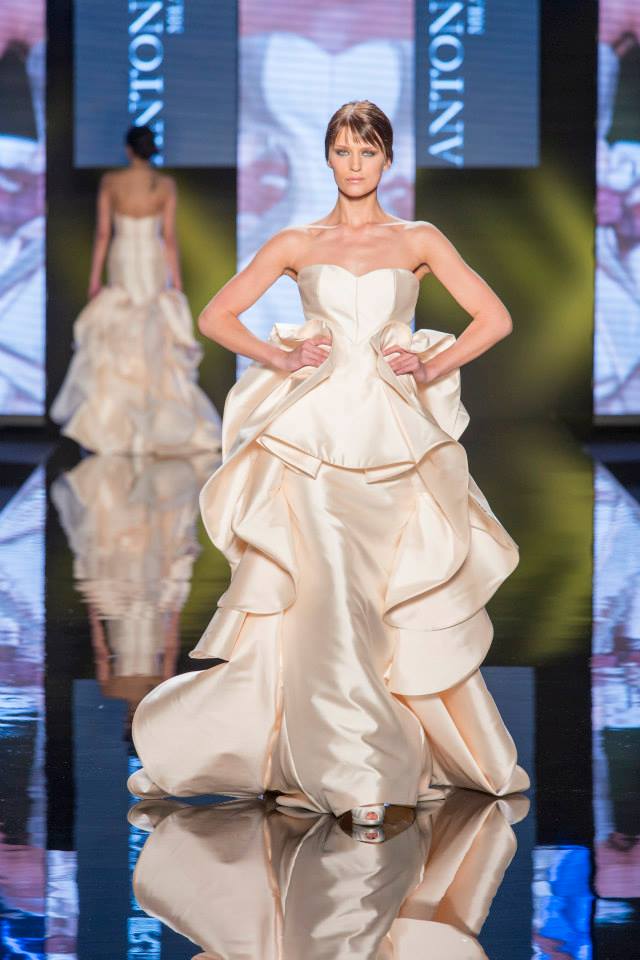 Il mikado è come sempre protagonista, anche di questa collezione sposa Antonio Riva 2016, tessuto ideale per dare forma alle architetture equilibrate e alle asimmetrie volumetriche delle gonne anche dell'abito da sposa corto e delle inconfondibili code di questa collezione presentata in anteprima a Si Sposaitalia 2015.
