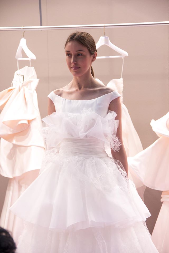 Spettacolari gli abiti da sposa in tulle di seta plissettata e prettata in diverse lunghezze sovrapposti l’uno all’altro, arricchiti da inserti in pizzo; due sculture vaporose per spose davvero speciali.