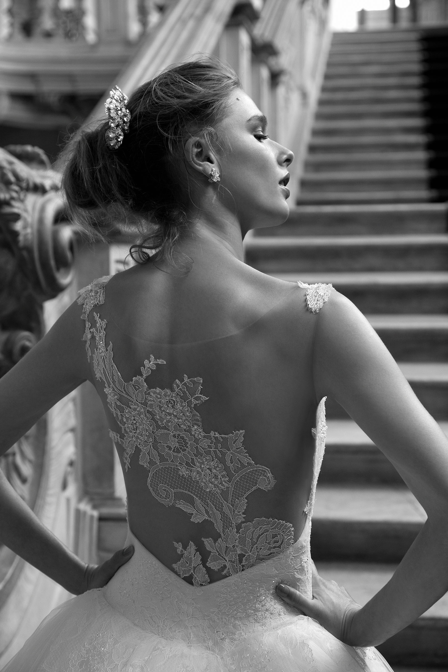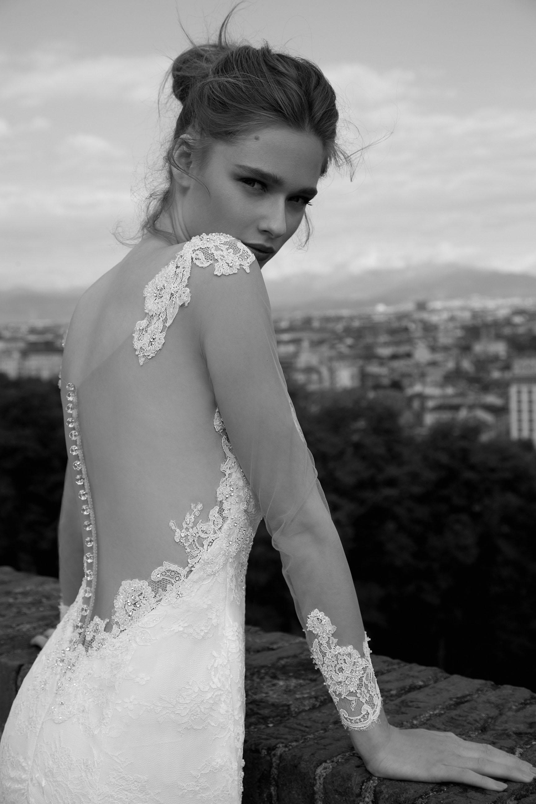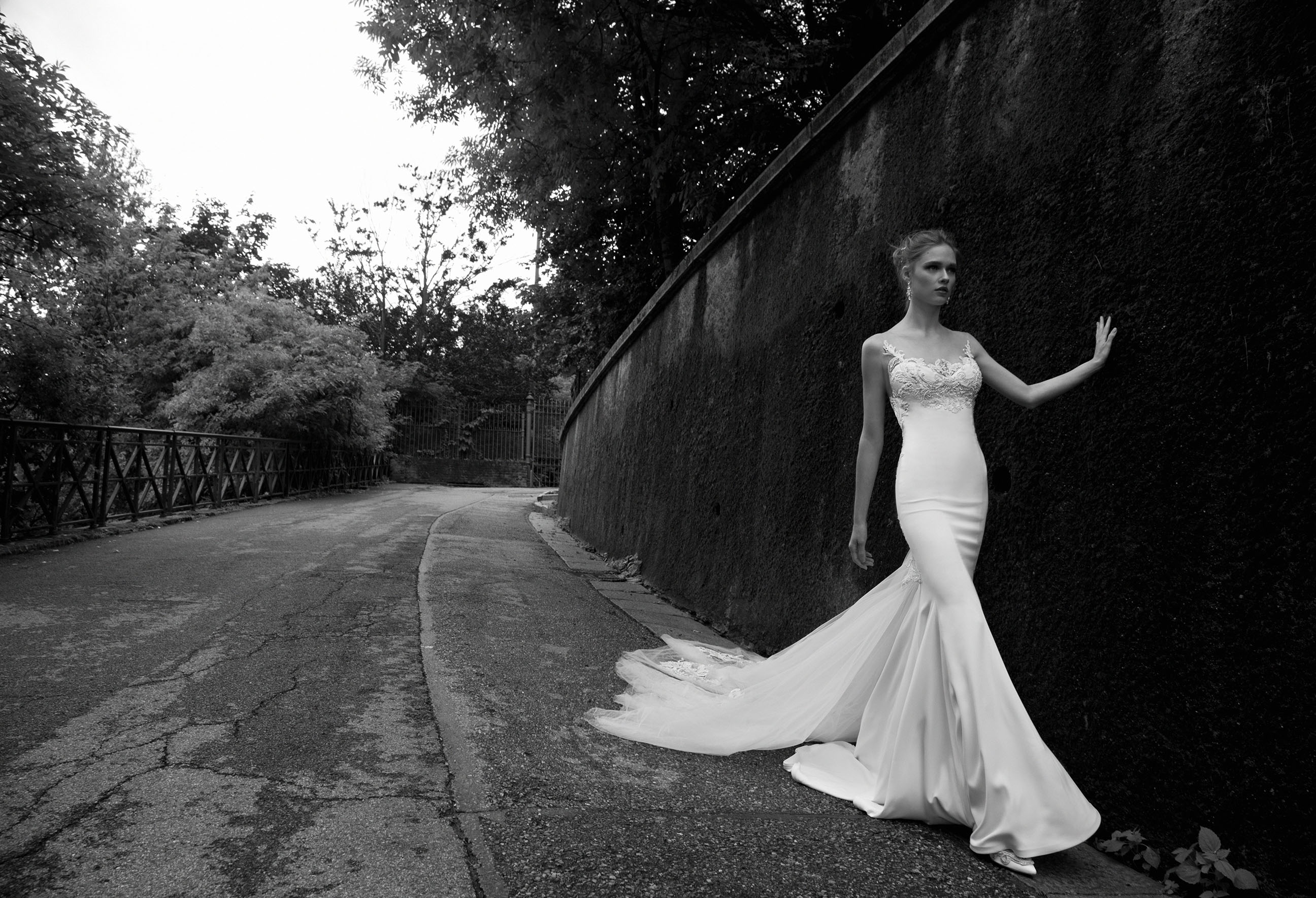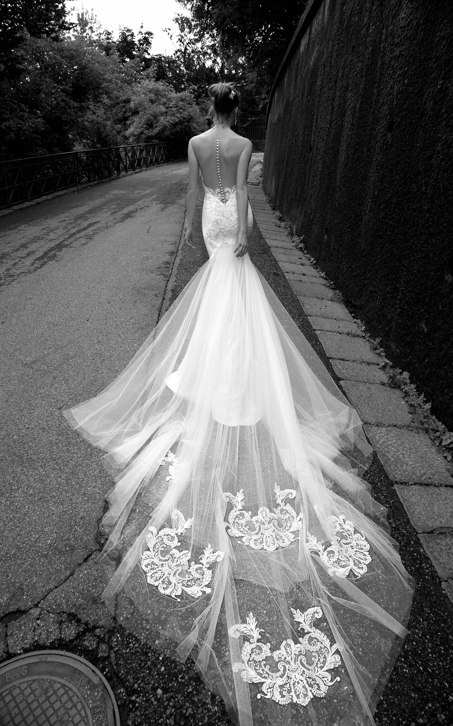 La collezione comprende diversi abiti da sposa con effetto tattoo, scollature e schiene velate arricchite da ricami e decorazioni floreali e dettagli scultura.