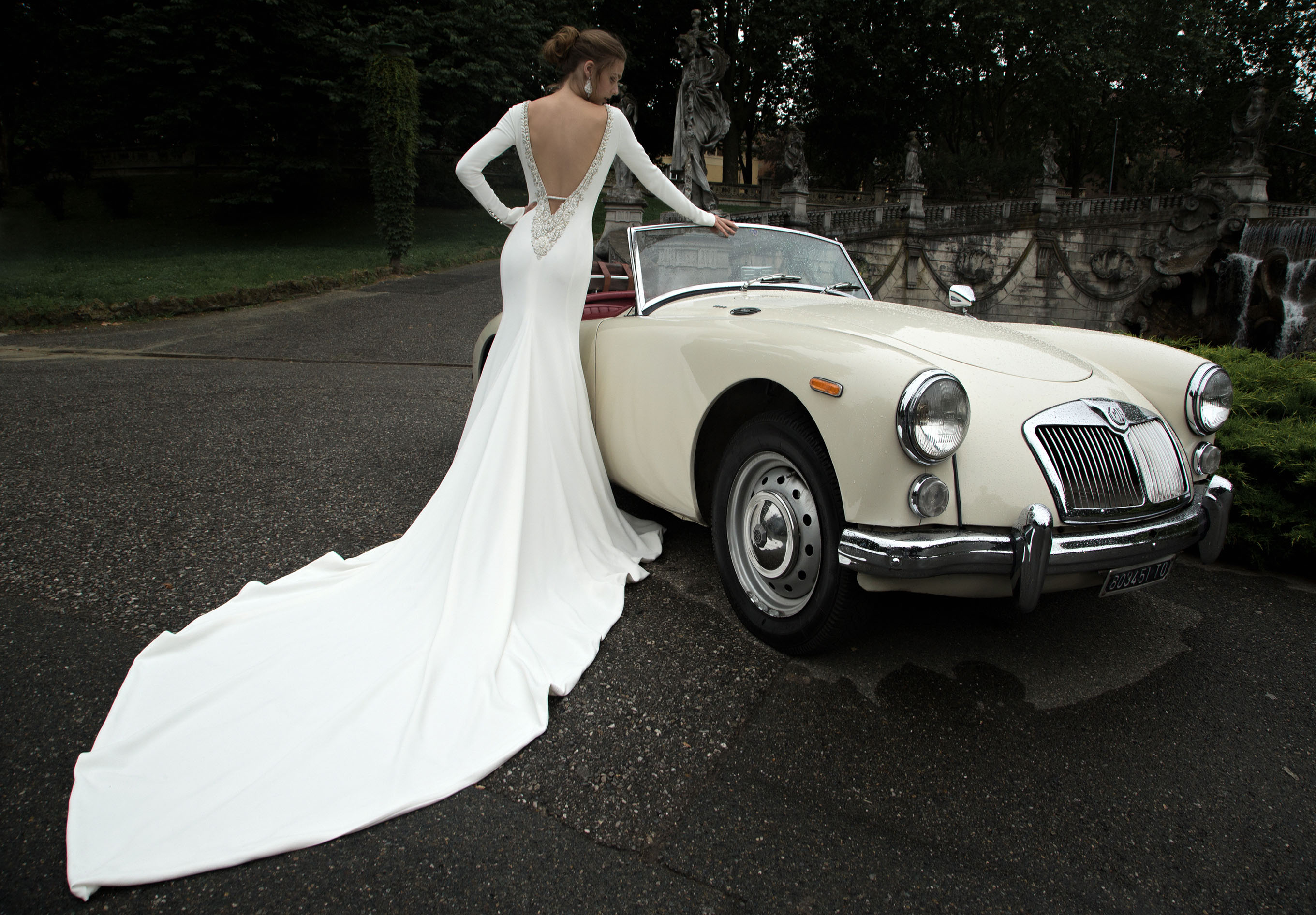 Spazio anche agli abiti da sposa scivolati dalle lunghissime code, come il modello Tecia, con ampio scollo a V fronte e retro abbellito da ricami e il modello Teodata, abbellito da particolari inserti in pizzo.