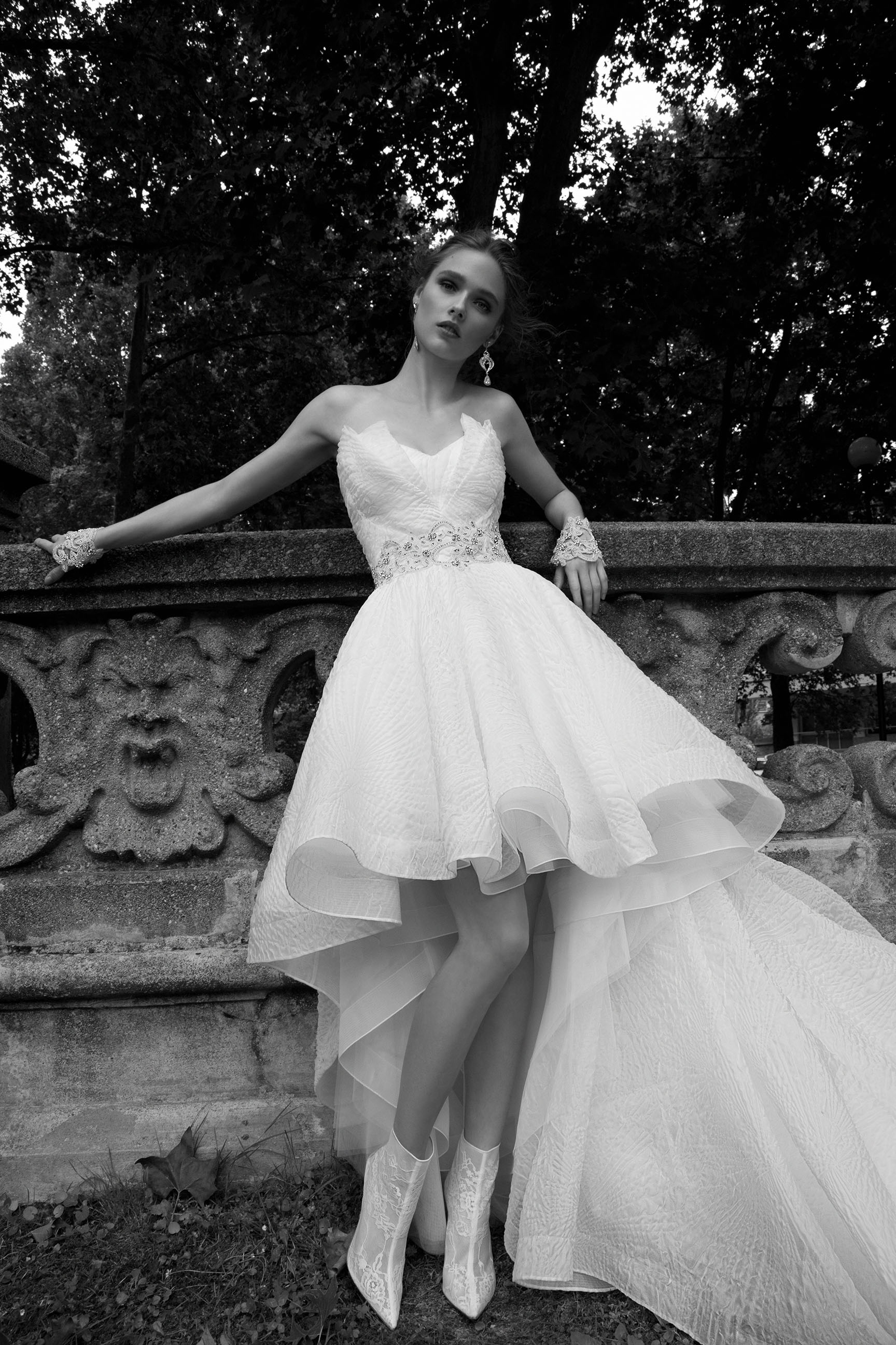 Presenti nella collezione anche esempi di abito da sposa lungo-corto, perfetti per esaltare le gambe sfoggiare scarpe da sposa da urlo, come quelle prodotte dal brand.