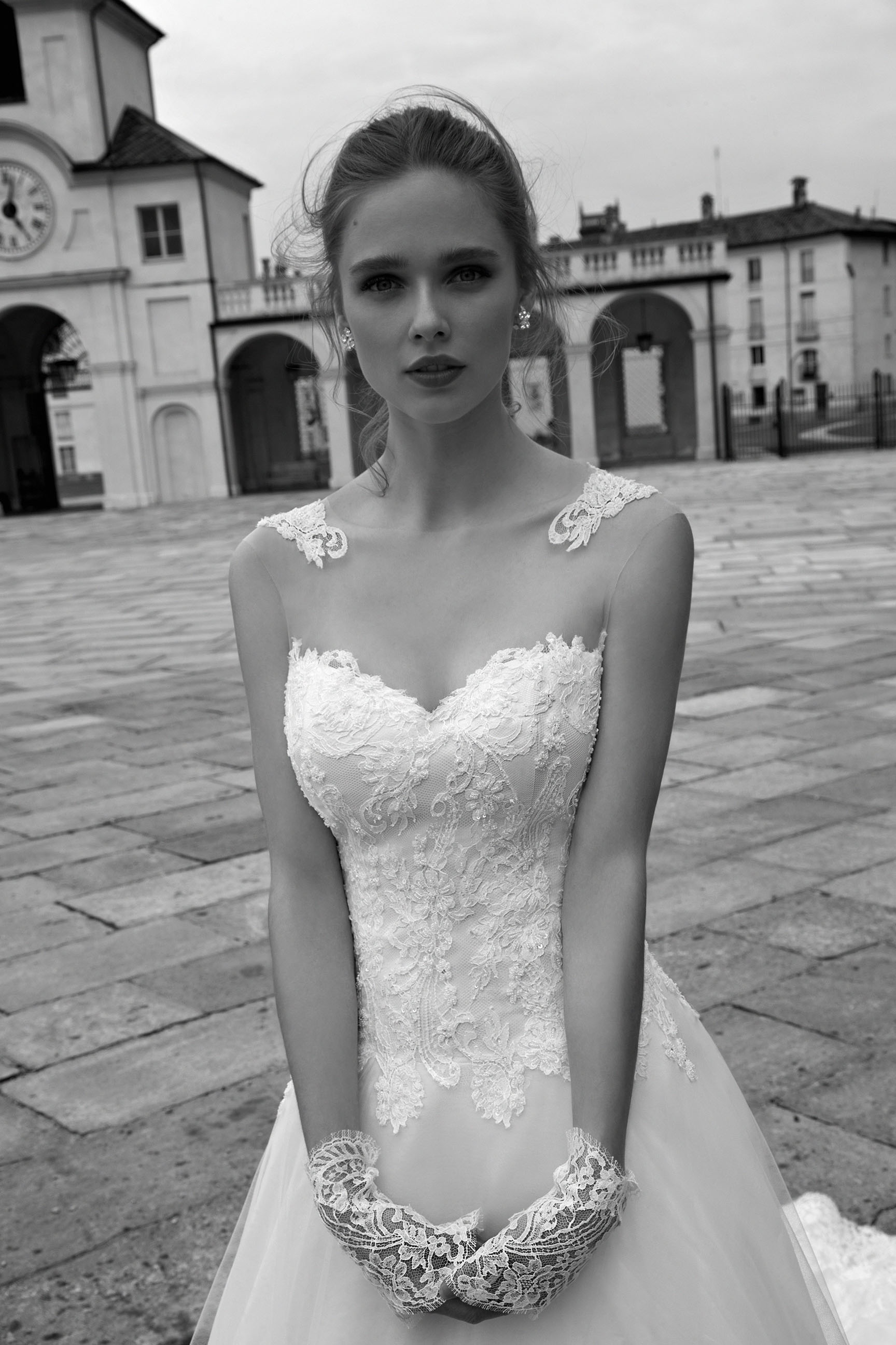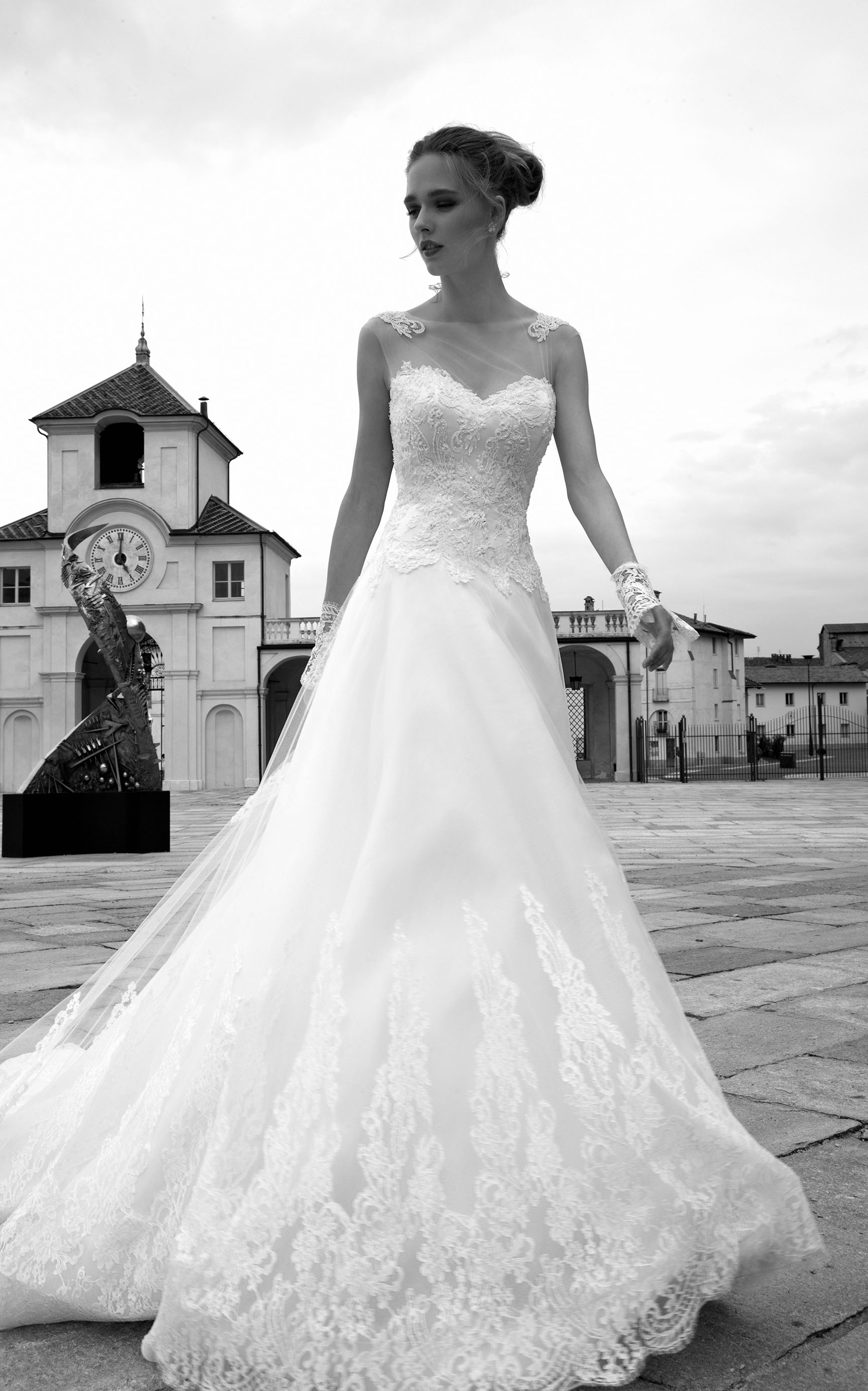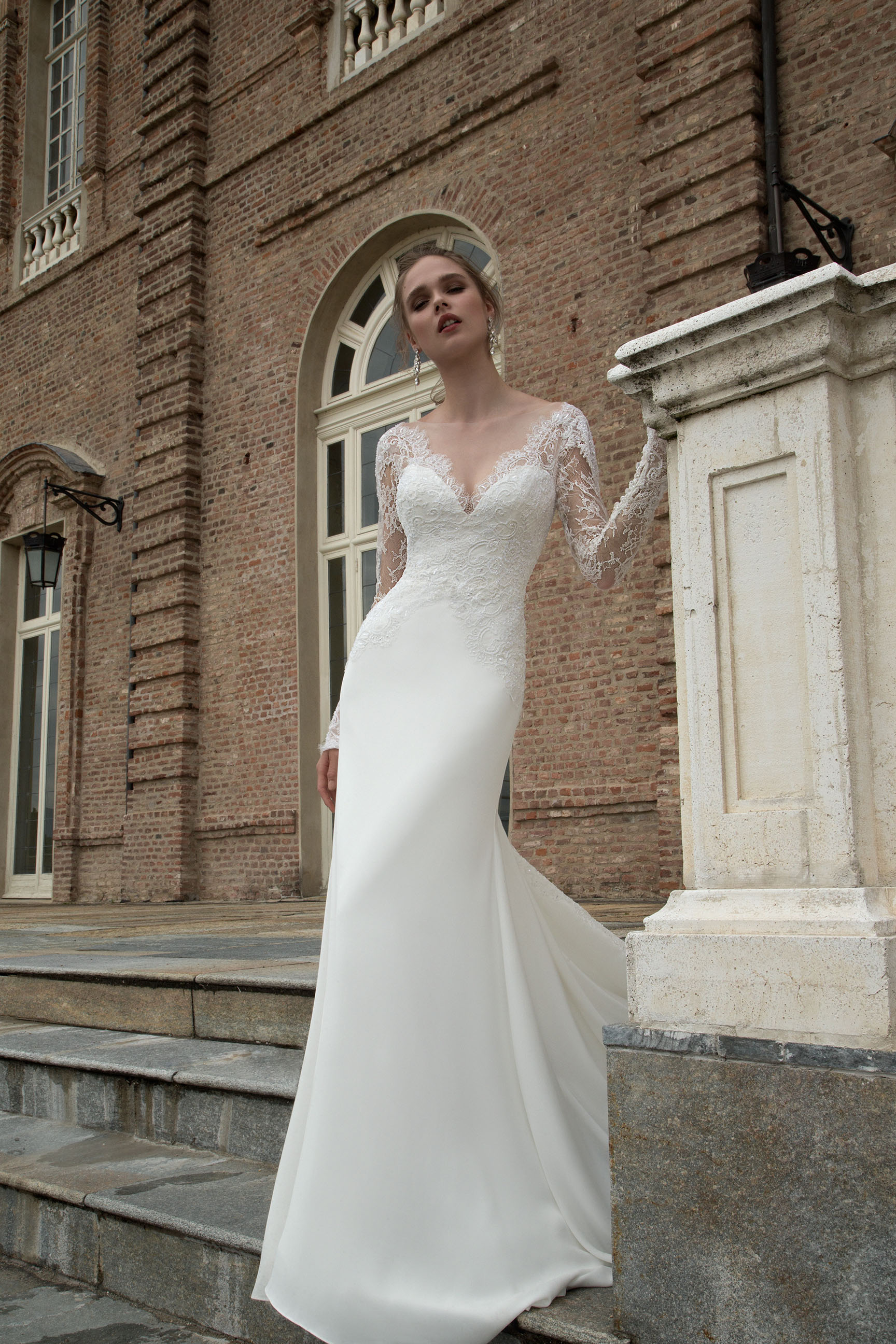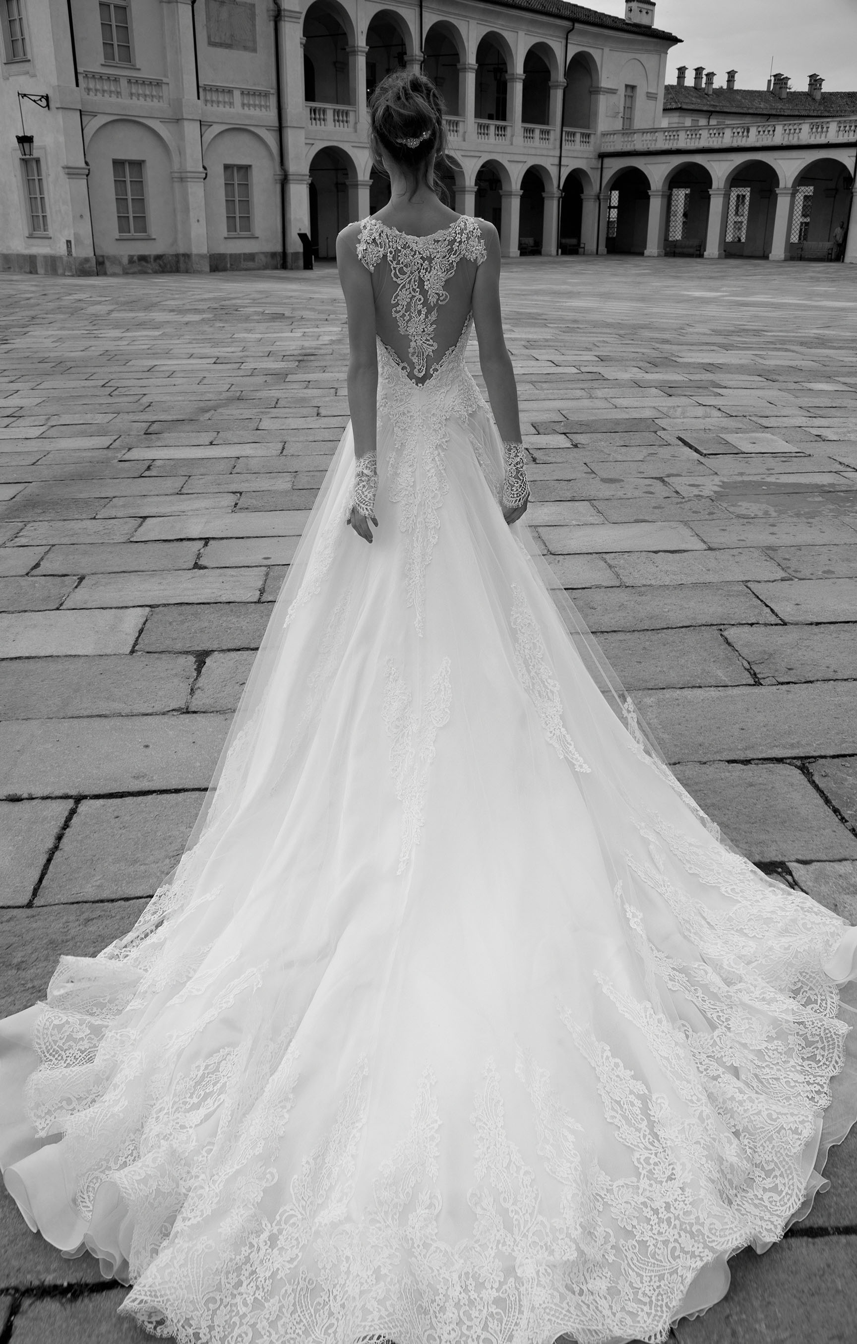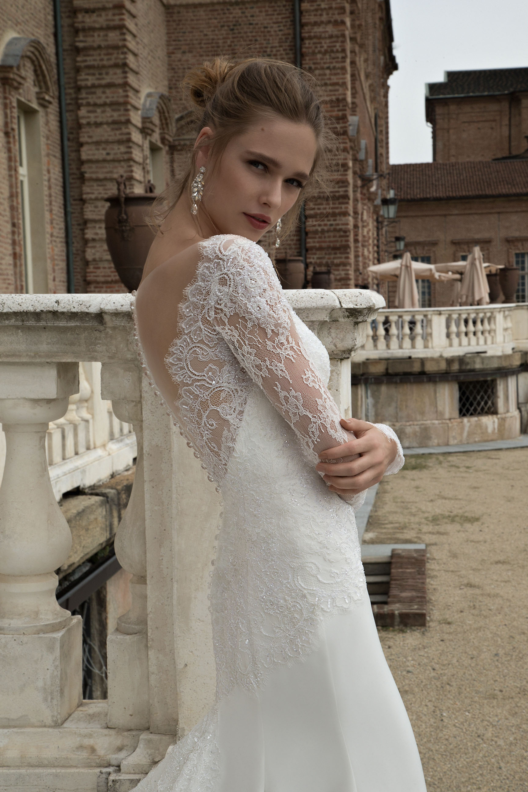 Davvero spettacolarie, poi, gli abiti Tatiana e Tory, doppiati in pizzo con schiena velata, e Tessy, un trionfo di applicazioni in pizzo che ornano tutto l'abito dalle maniche lunghe e schiena velata.