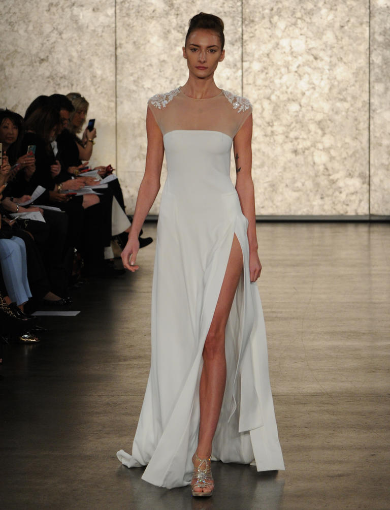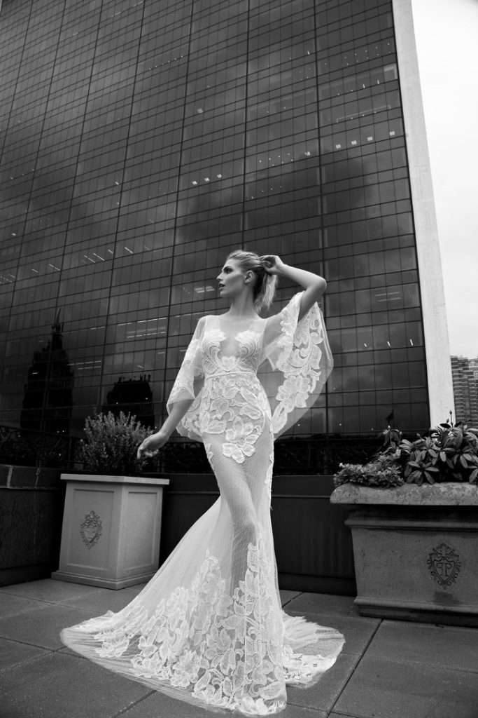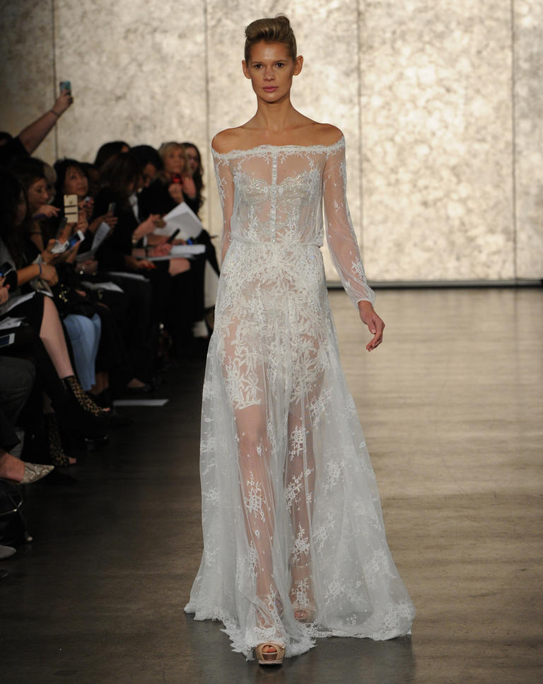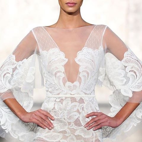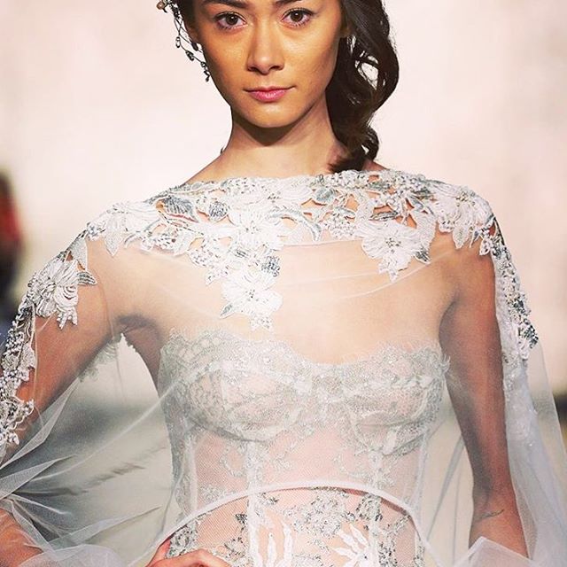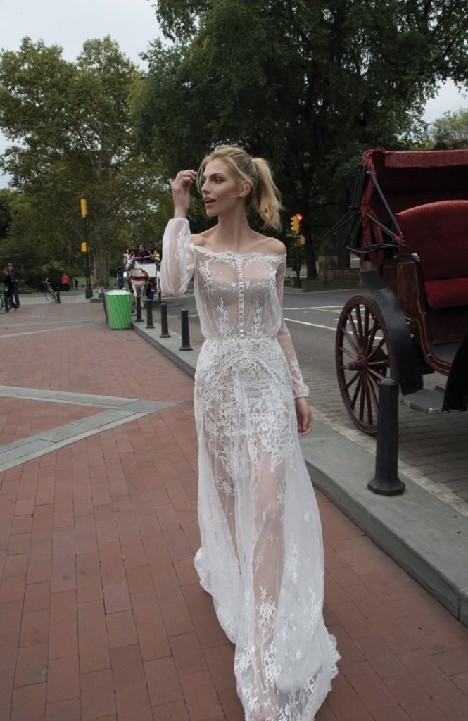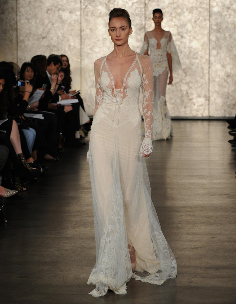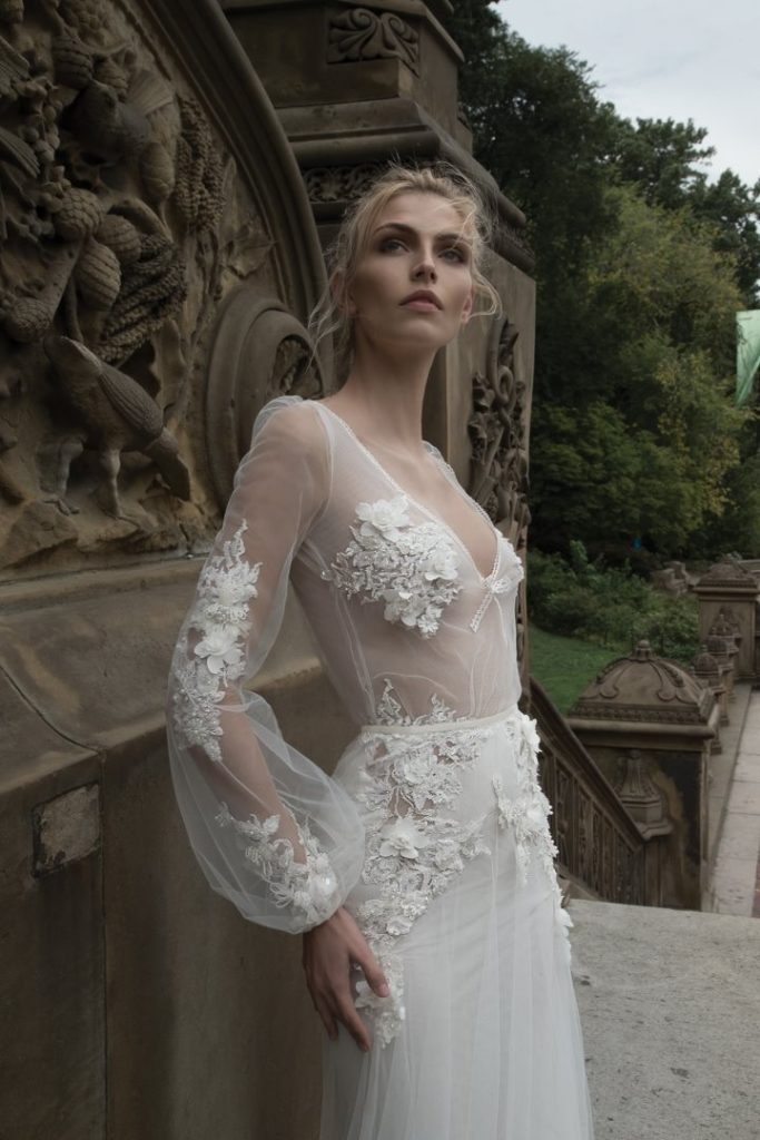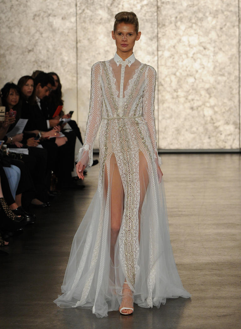 Dopo aver aperto la collezione si apre con un abito in pizzo crochet verticale (visto sopra) dalla maniche lunghe, con collo alto ed inserti in pizzo, dove è già visibile l'ispirazione alla camicia maschile, ecco il secondo abito da sposa, un modello a strati con pizzo Chantilly e tulle point d'esprit arricchito da un delicato ricamo con perle e cristalli.