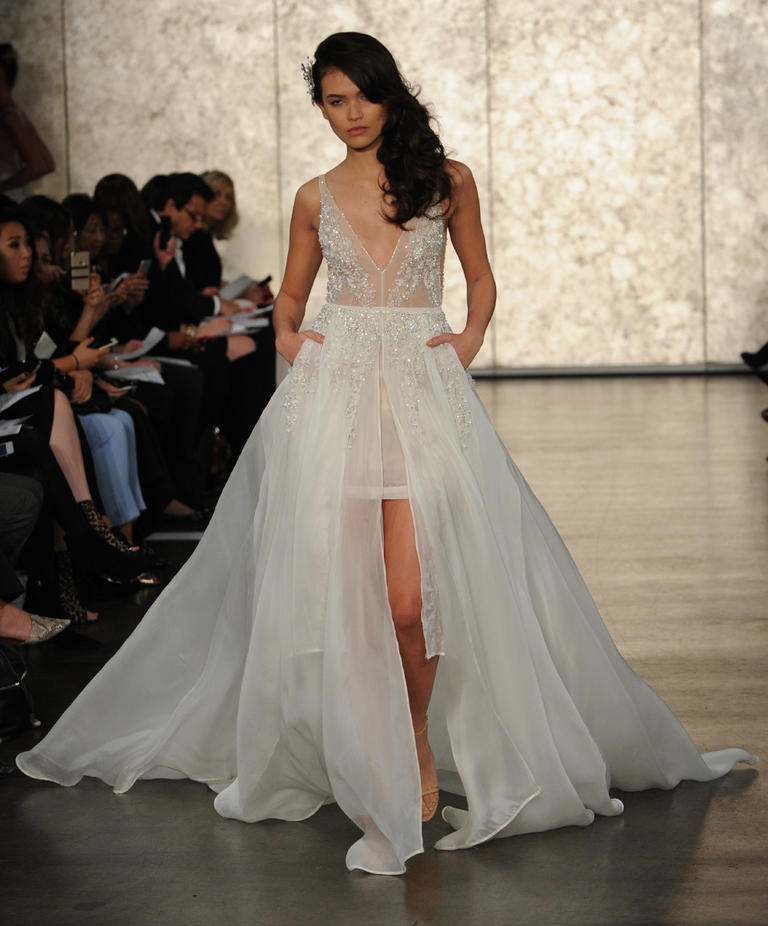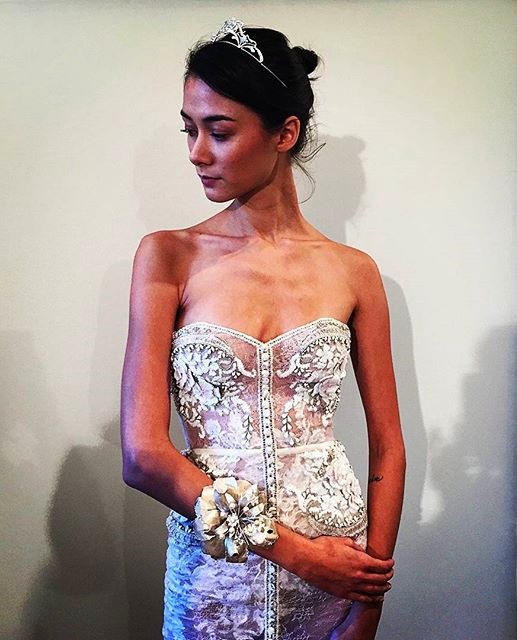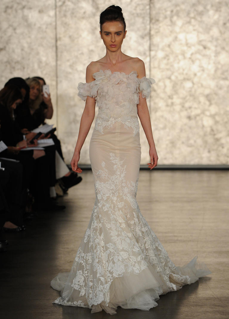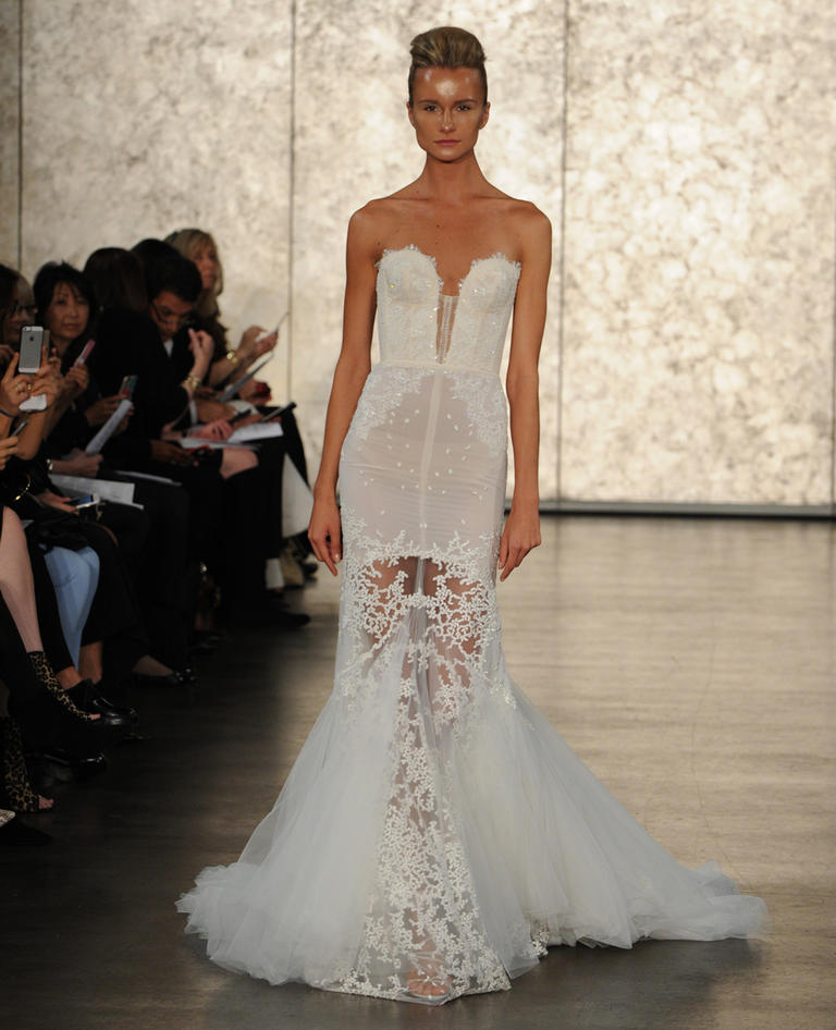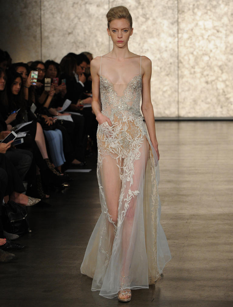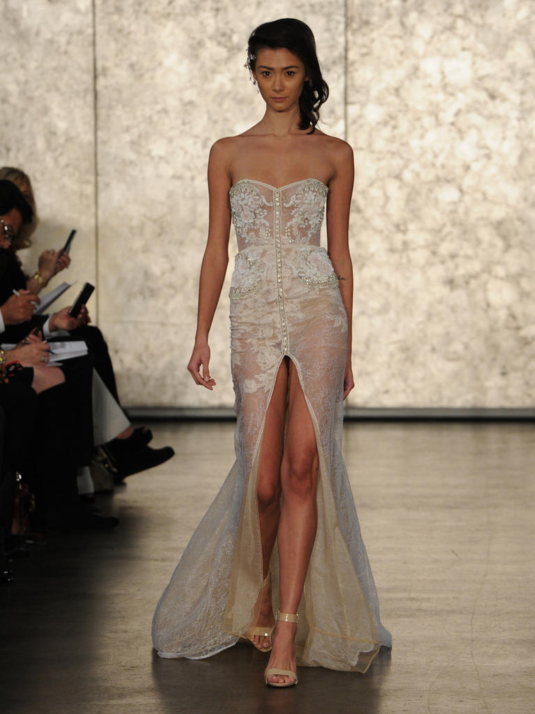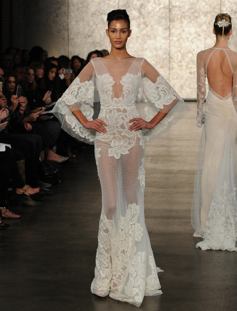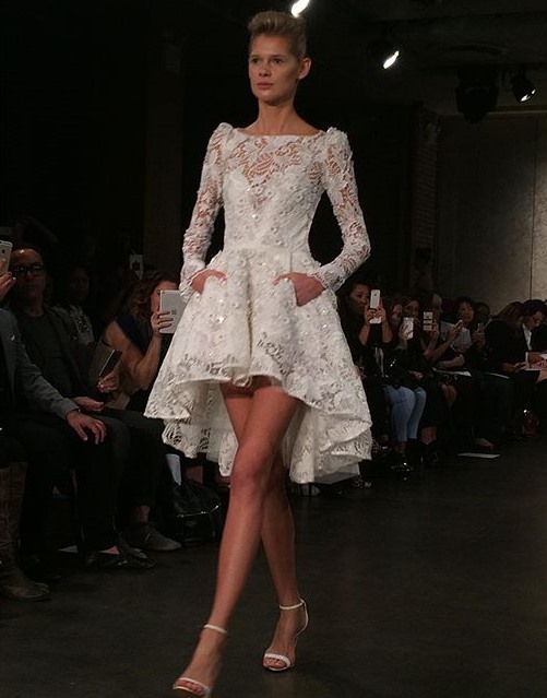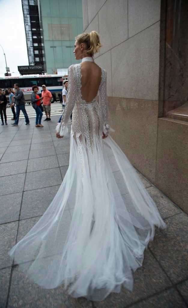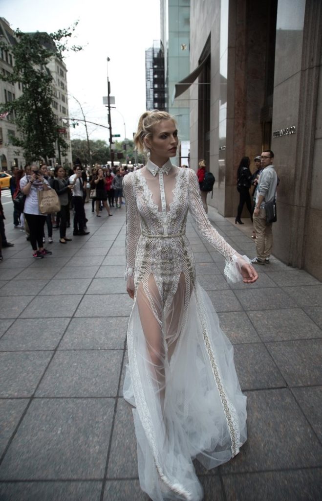 Dopo aver aperto la collezione si apre con un abito in pizzo crochet verticale (visto sopra) dalla maniche lunghe, con collo alto ed inserti in pizzo, dove è già visibile l'ispirazione alla camicia maschile, ecco il secondo abito da sposa, un modello a strati con pizzo Chantilly e tulle point d'esprit arricchito da un delicato ricamo con perle e cristalli.
