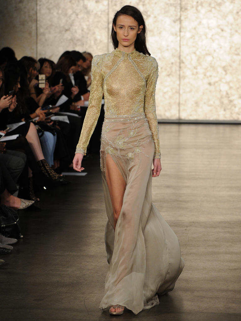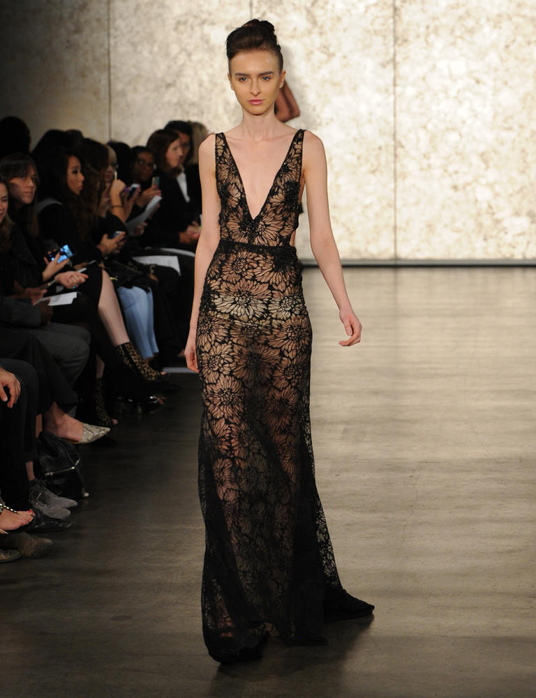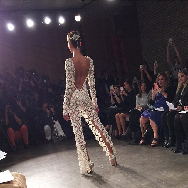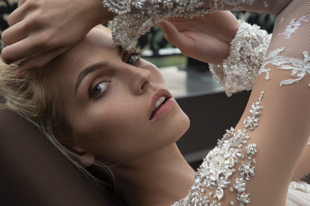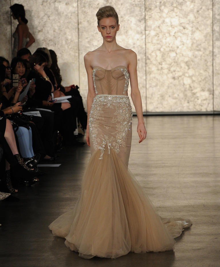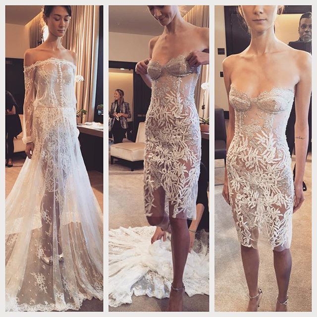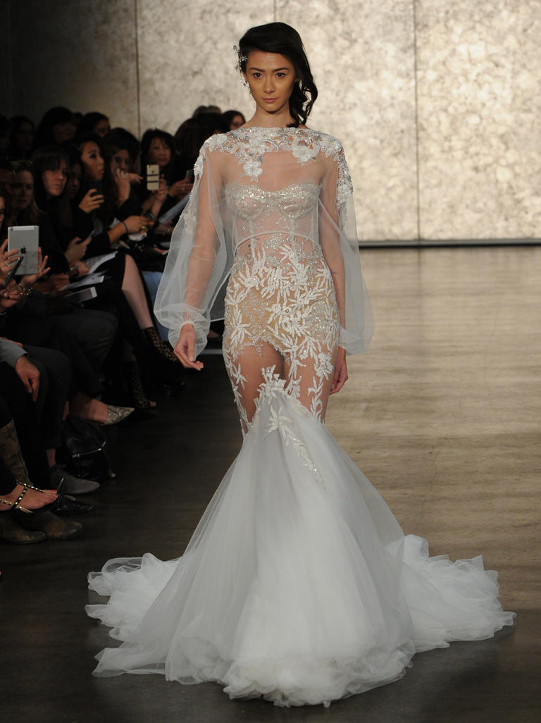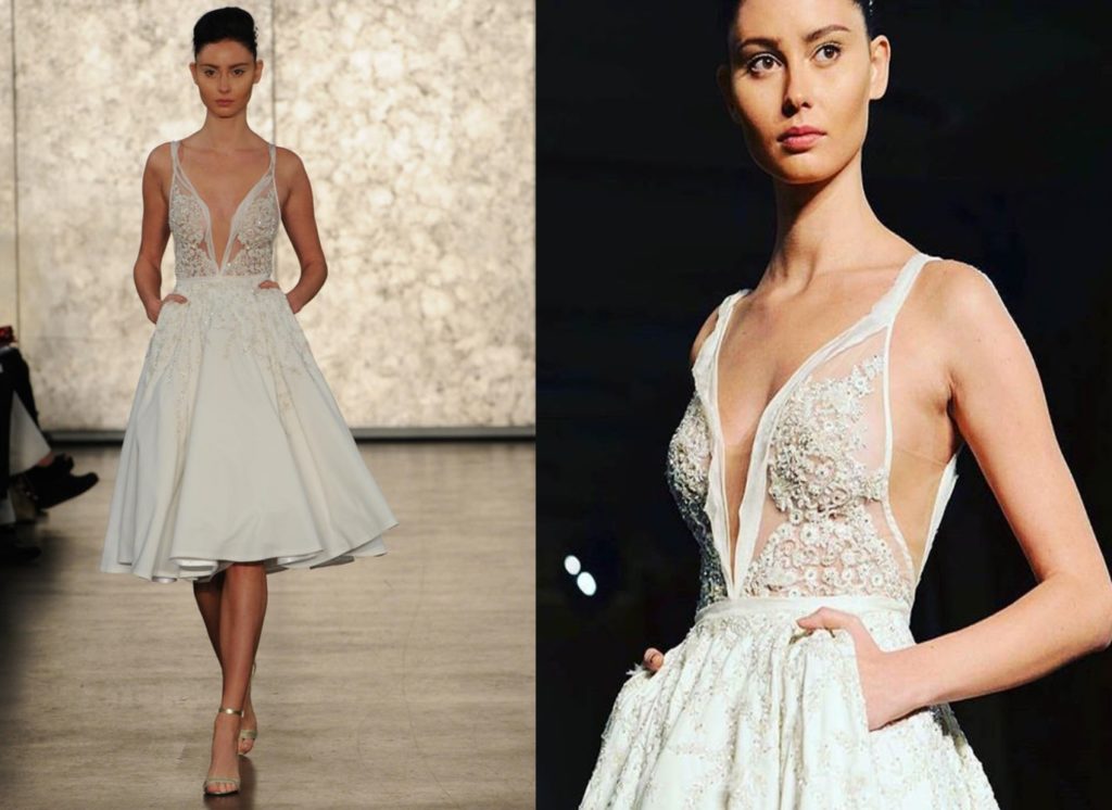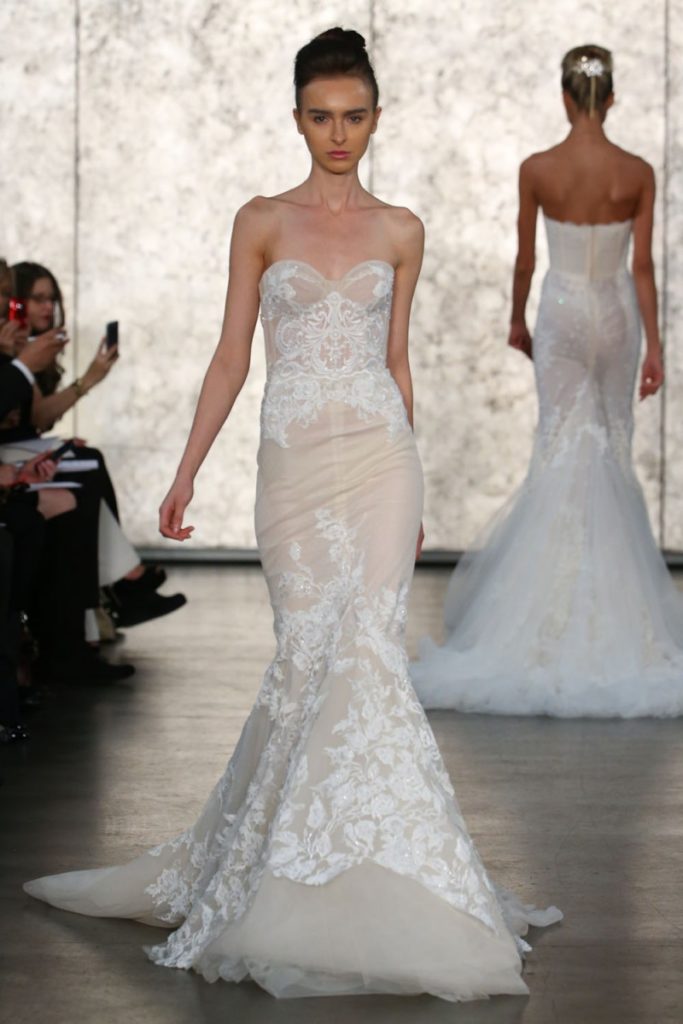 Dopo aver aperto la collezione si apre con un abito in pizzo crochet verticale (visto sopra) dalla maniche lunghe, con collo alto ed inserti in pizzo, dove è già visibile l'ispirazione alla camicia maschile, ecco il secondo abito da sposa, un modello a strati con pizzo Chantilly e tulle point d'esprit arricchito da un delicato ricamo con perle e cristalli.