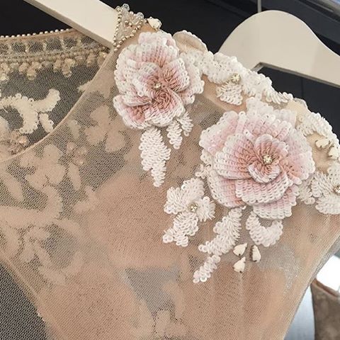 Fitti ricami per l'abito da sposa a tubino rosa cipria in pizzo Chantilly con fiori ricamati.