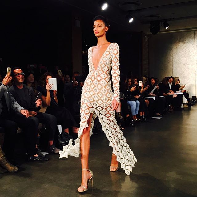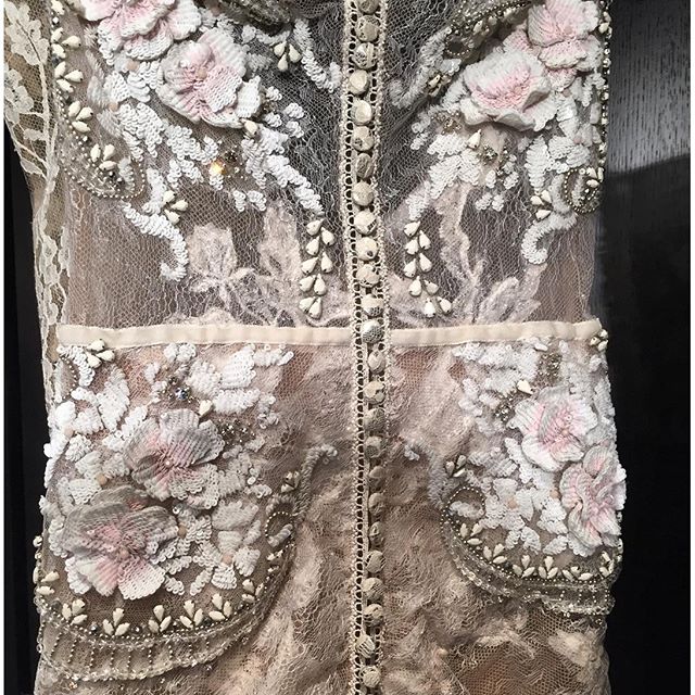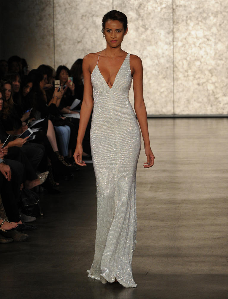 Vediamo il bellissimo ricamo sul retro dell'abito, mentre si incontra con il modello successivo, un abito impalpabile in pizzo argento con ricami a vite.