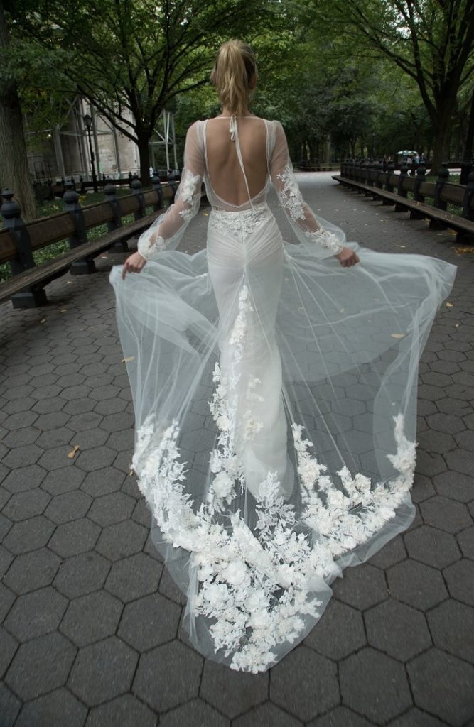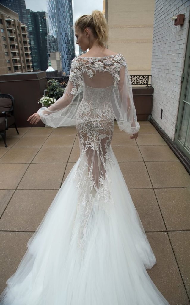 Tulle e pizzo Chantilly per l'abito da sposa a sirena con svollo a V, maniche lunghe, ricami floreali e apertura sulla schiena.