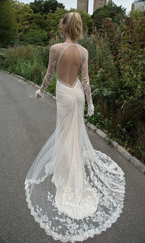 Ed ecco anche in questa collezione comparire la tuta da sposa, una proposta originale che sta prendendo sempre più piede dalle collezioni 2015 in avanti, qui presentata in pizzo crochet con maniche lunghe e orlo aperto dietro.